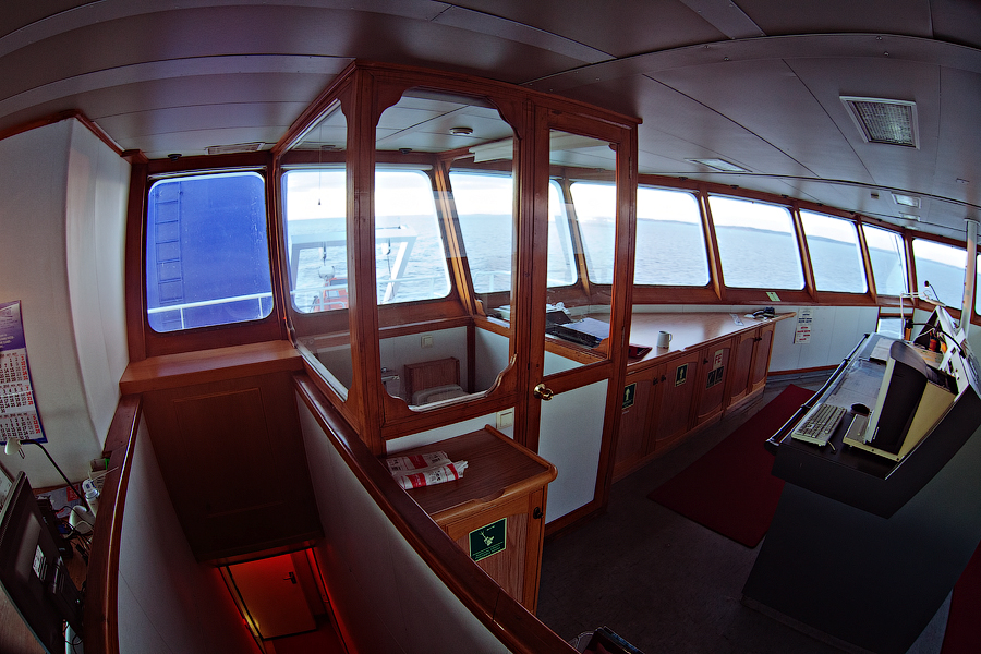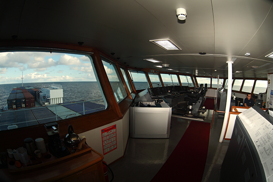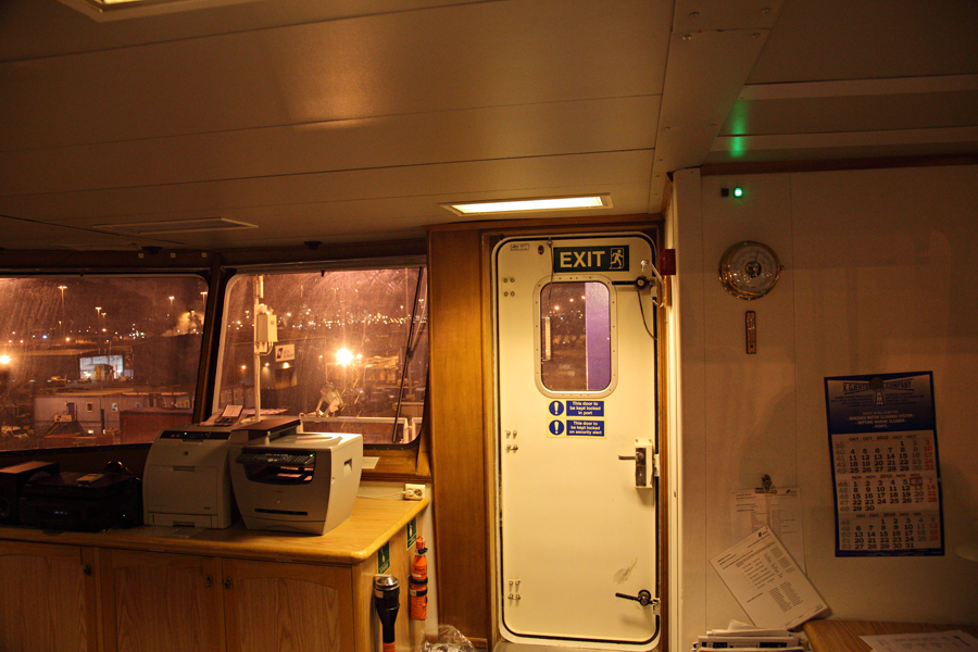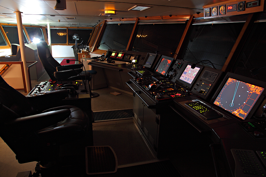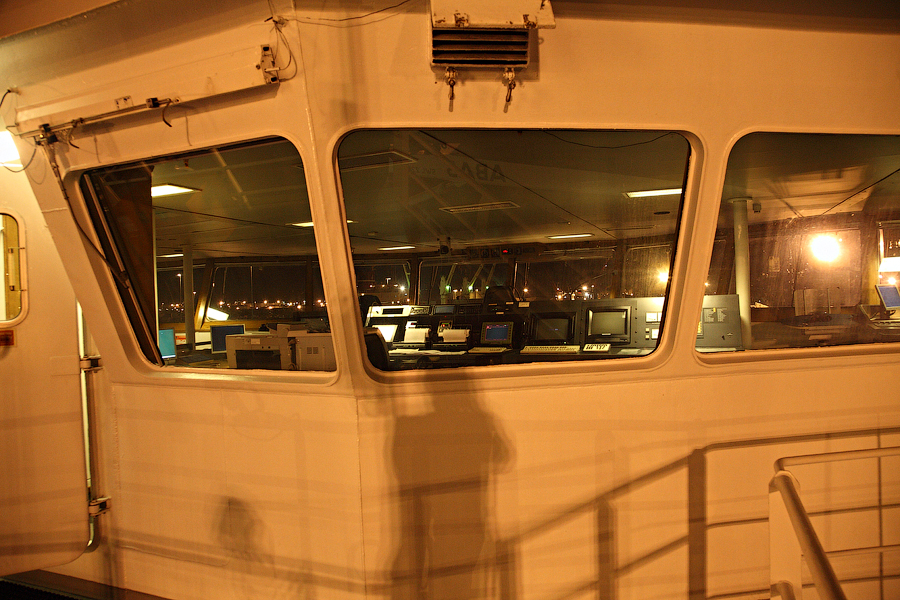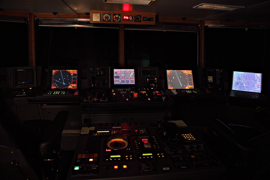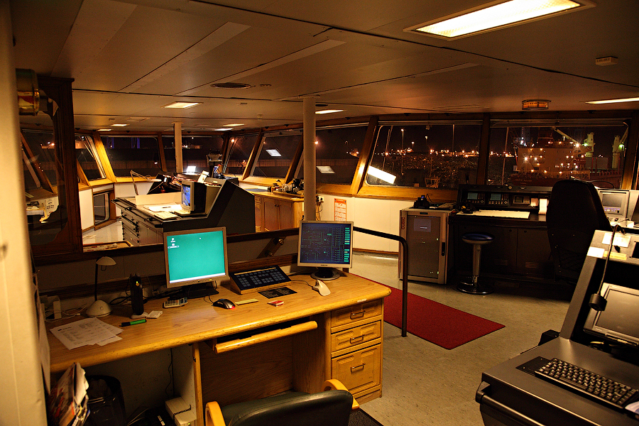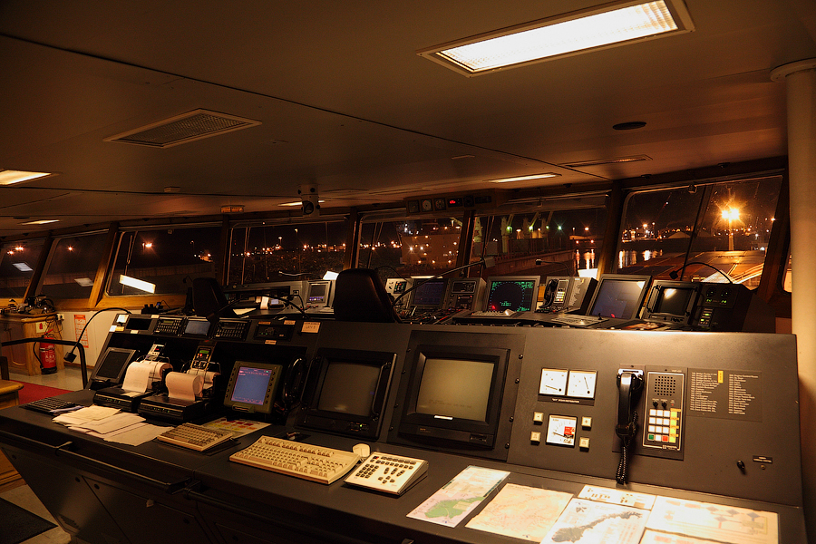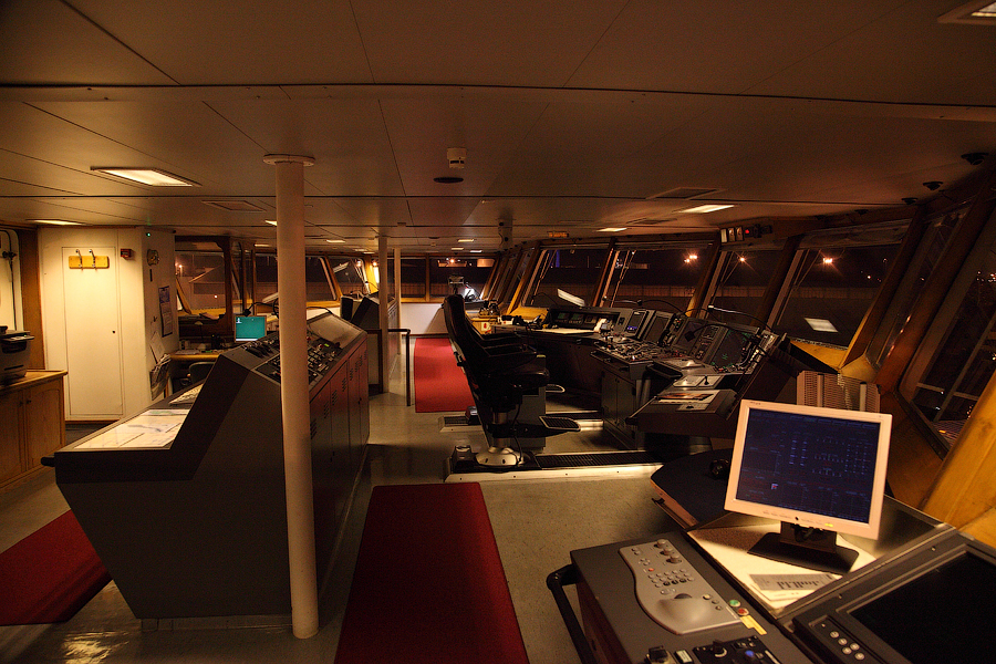 Во время съемки мне приходилось включать дополнительное освещение,чтобы у вас была возможность хоть что-то разглядеть. А на самом деле,капитанский мостик ночью выглядит словно новогодняя елка-в кромешной темноте сверкает разноцветными лампочками навигационное оборудование