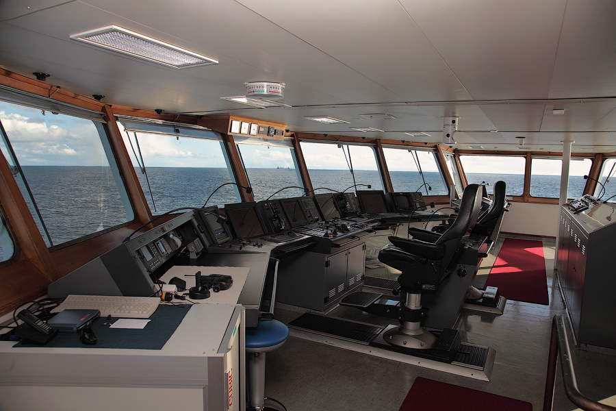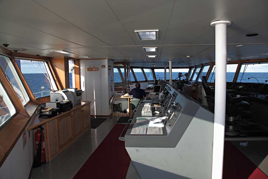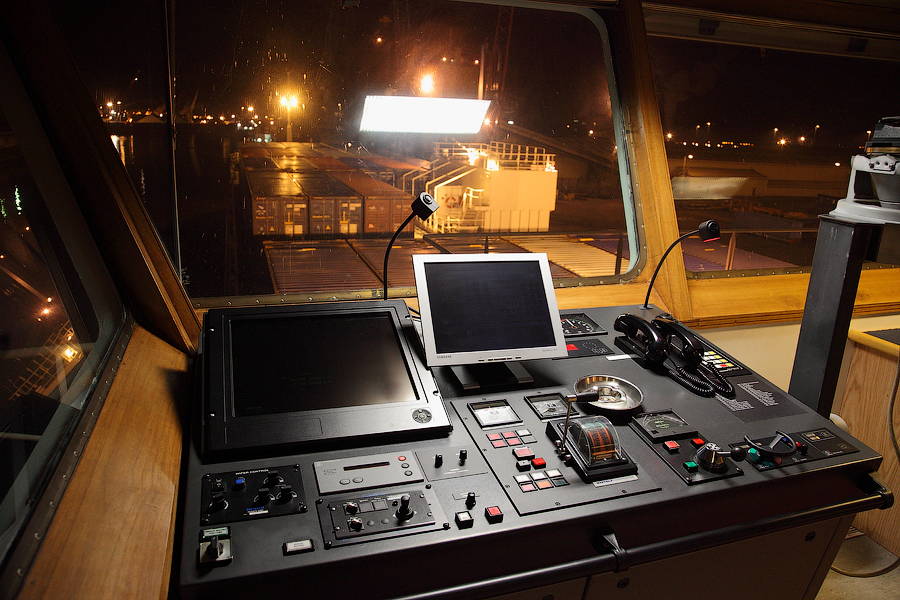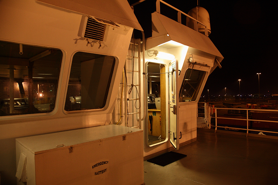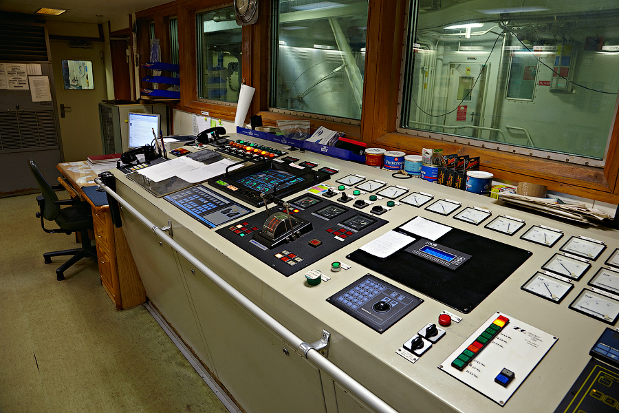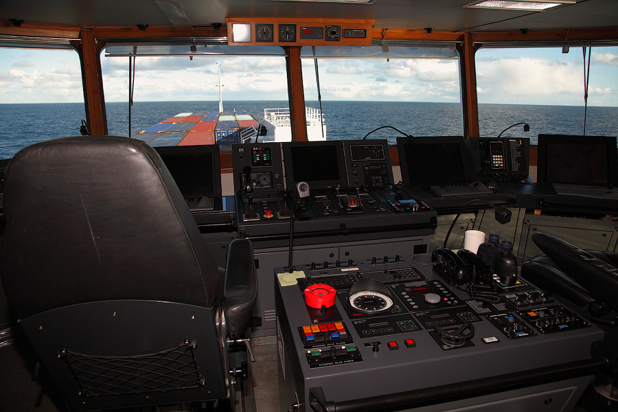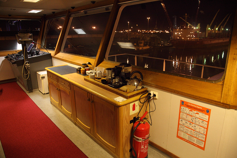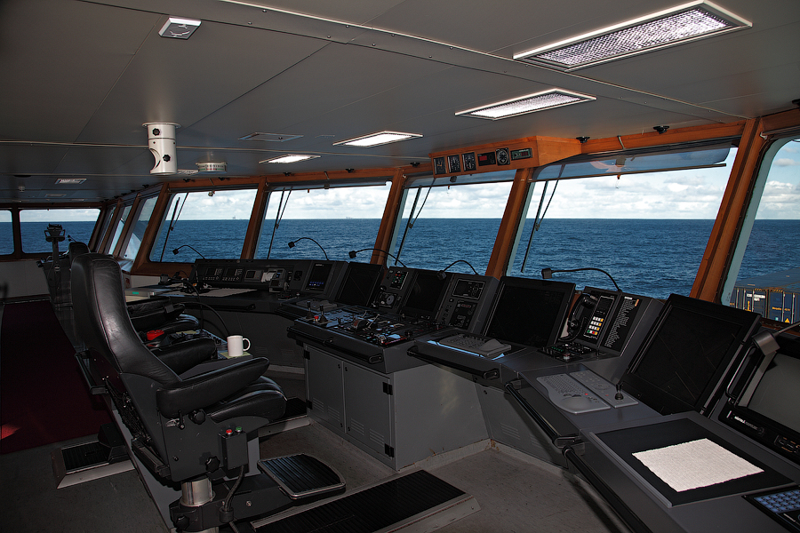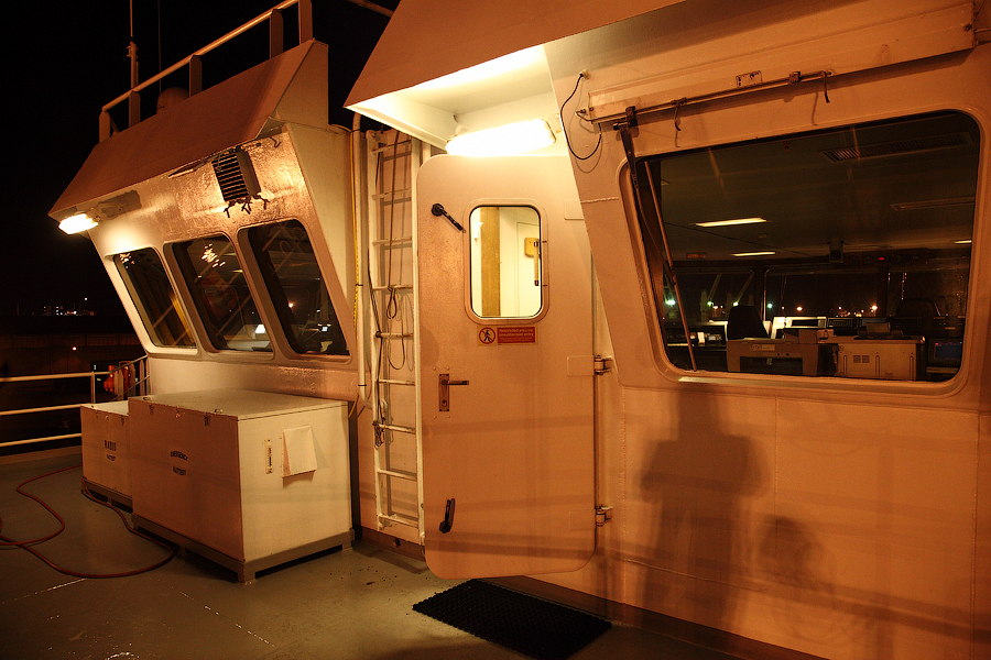 Во время съемки мне приходилось включать дополнительное освещение,чтобы у вас была возможность хоть что-то разглядеть. А на самом деле,капитанский мостик ночью выглядит словно новогодняя елка-в кромешной темноте сверкает разноцветными лампочками навигационное оборудование