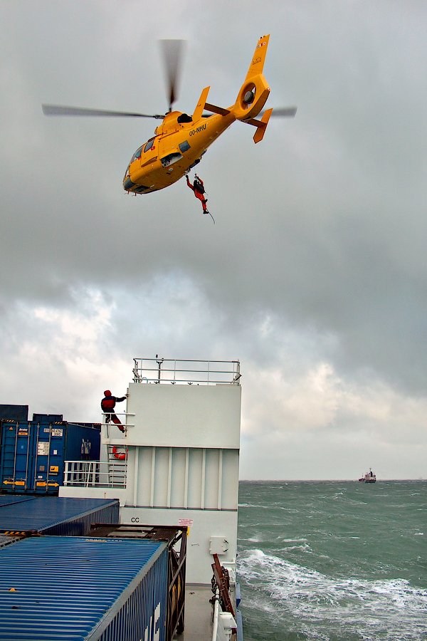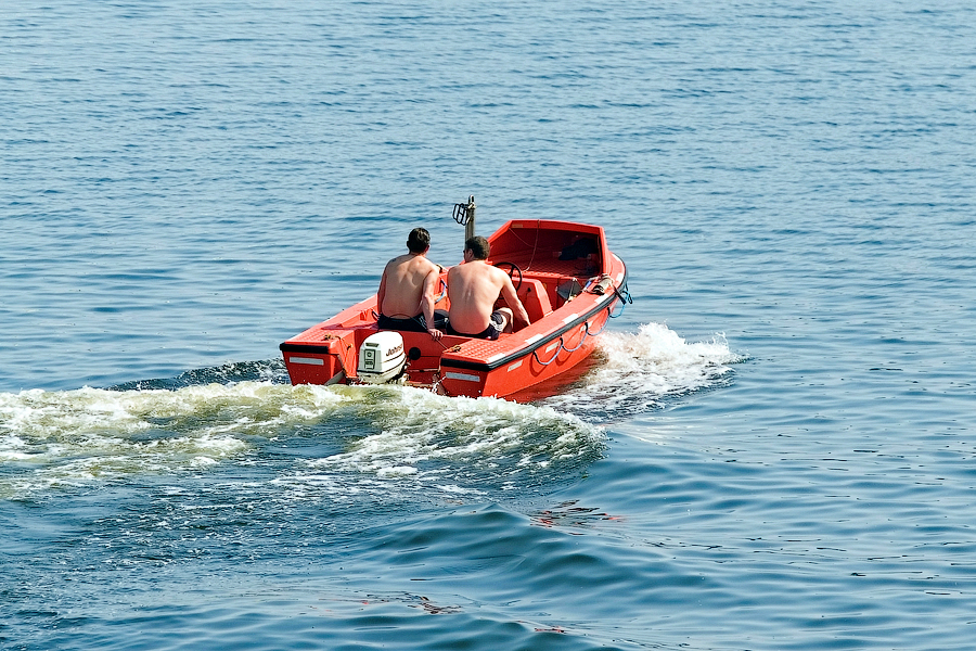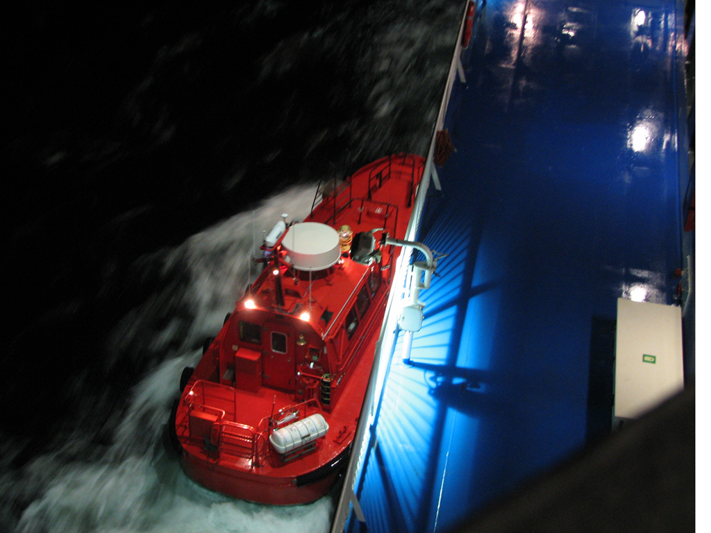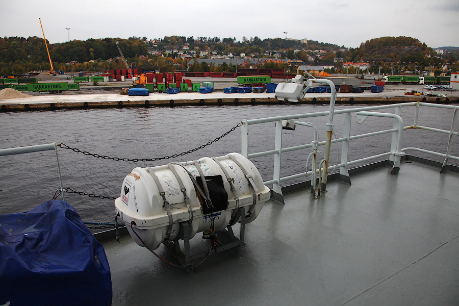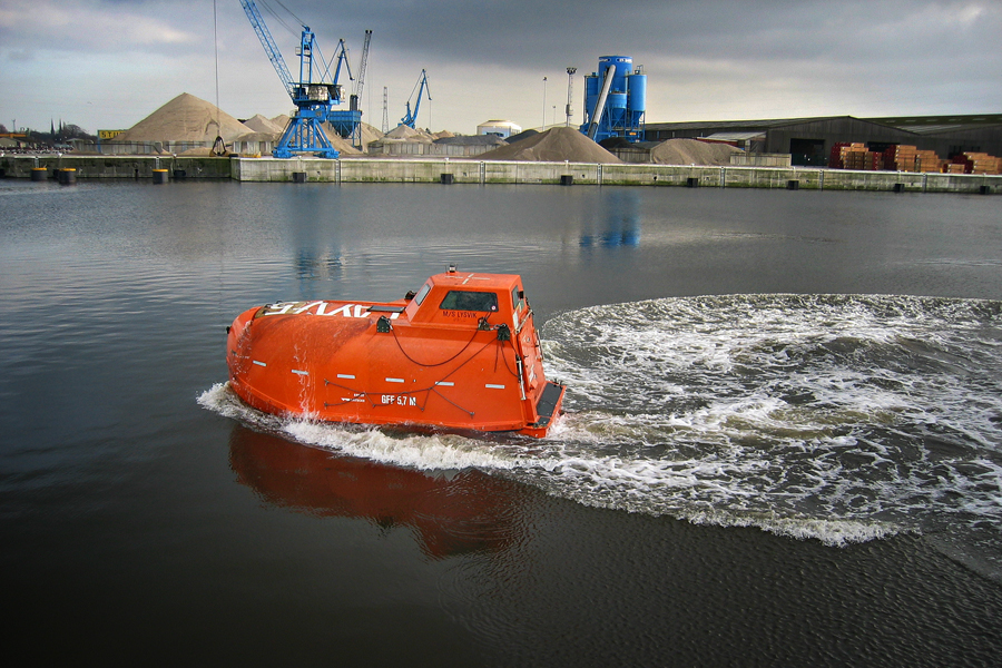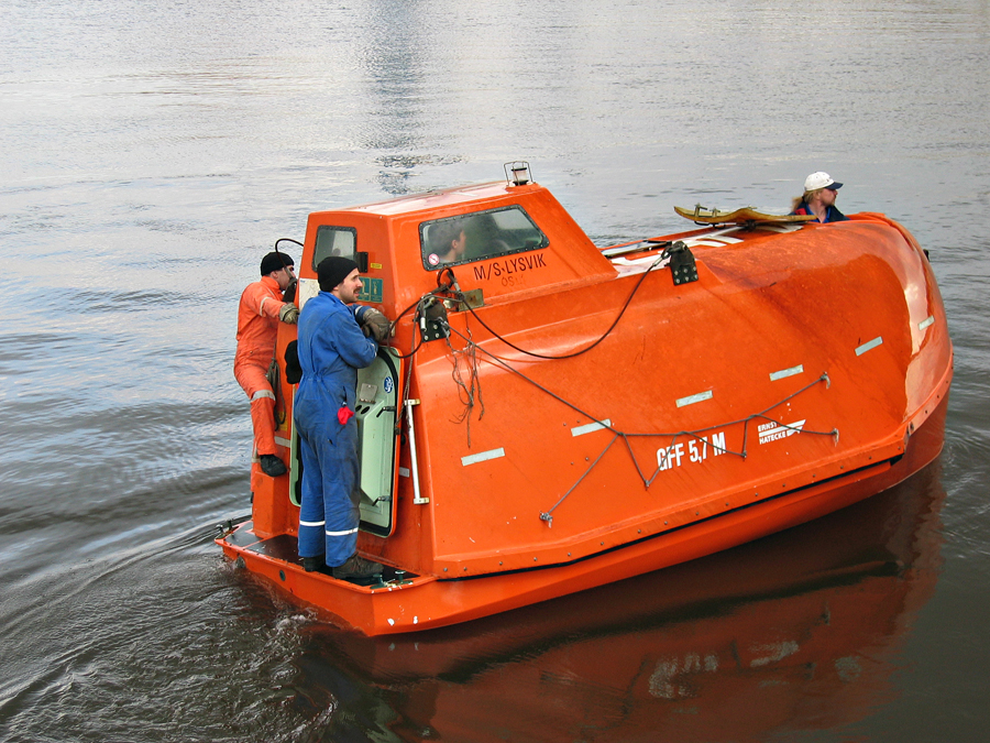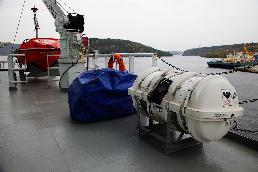 ....Продолжение.... Глава 3. "Спасение утопающих-дело рук самих утопающих",или "Полетаем,ну и пусть разобьемся!" Взлетает самолет. В салон выходит стюардесса: - Уважаемые пассажиры! Вас приветствует компания "Underwater Airlines"! Наш самолет пилотирует летчик-испытатель, заслуженный мастер парашютного спорта, специалист по отпугиванию акул и подаче громкого крика о помощи при волне высотой до 7,5 метров.. и температуре воды до 0 градусов.. Пароходы имеют гадкое свойство тонуть.Приятного в этом мало .Ну сами представьте эту картину-шторм,качка,кромешная темнота,пронизывающий холодный ветер ....и Селин Дион,черт бы ее побрал с "My heart will go on!" .........Брррр....Dead Нет,ну это ведь понятно,что утонуть вместе с пароходом для моряка дело почетное,но как-то ...неохота. Вот именно для тех,кому неохота,на пароходе имеются спасательные средства-шлюпки и надувные плоты.И моряк должен обладать хотя бы маленькой частичкой веры в то,что вся эта херня сможет его спасти в трудную годину.Признаюсь,верится с трудом. И регулярные шлюпочные тревоги,проводимые на судне,эту веру почему-то никак не укрепляют Как показывает статистика кораблекрушений,больше всего шансов у моряков спастись на самораскрывающихся надувных плотах: 40. 41. Во время кораблекрушения, эти плоты сбрасываются в море. От удара об поверхность воды плот самораскрывается и надувается. Чтобы его не отнесло волной далеко от борта судна,плот будет удерживаться привязанным к корпусу судна длинным линем (на снимках выше линь-это красная веревка,которая выходит из плота и крепится к гирозамку). После чего,задача моряка будет спрыгнуть в воду и забраться в плот. Ну и обязательно нужно будет разрезать линь ножом (который входит в комплект плота),чтобы переворачивающееся судно не потянуло плот за собой. Еще один важнейший спасательный элемент на судне-это спасательная шлюпка,так называемая "Free-fall boat",то-есть "шлюпка свободного падения,во как! И,надо отметить,название очень точно обозначает суть этой спасательной шлюпки .На ней действительно приходится лететь в воду,ну практиически как этот вот сокол : 42. На предыдущих фотографиях вы уже видели эту спасательную шлюпку,она располагалась на корме судна Давайте теперь познакомимся с этой шлюпкой поближе Вот так вот выглядит штатное место для посадки экипажа в шлюпку: 43. Ну а теперь приоткроем дверцу и заглянем во внутрь шлюпки: 44. Ну как,напоминает вам салон "летательного аппарата"? Как видите,каждое кресло имеет ремни безопасности.И очень важно как можно надежнее зафиксировать свое тело этими ремнями.Ибо,удар шлюпки об воду-весьма чувствителен,и свихнуть себе шею-легче простого! 45. Ну а управлять нашим полетом будет второй штурман.Он займет свое место за штурвалом шлюпки,и ,когда экипаж будет готов к полету, разблокирует "ручной тормоз" и.........: 46.Полетели! (снято мыльничкой) Надо отметить,что моряки воспринимают такой полет всесьма по-разному . Кто-то трясется от страха,а кто-то испытывает чувства,близкие к оргазму 47.Поплыли! (мыльничное) Согласитесь,на воде наша шлюпка сразу как-то потеряла в шарме,да? Плывет себе оранжевый ботинок,и никакого гламура! Как вы понимаете,эти снимки я делал во время так называемой судовой шлюпочной тревоги. Понятное дело,что шлюпочку надо бы вернуть обратно на пароходик. Что мы и делаем,с помошью шлюпочной лебедки: 48. Наверх! (мыльничное) Если в
