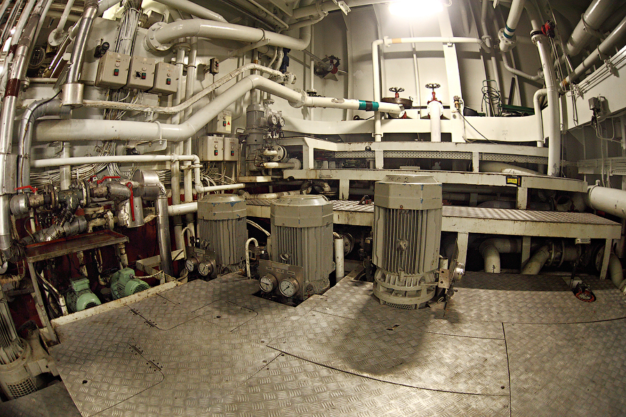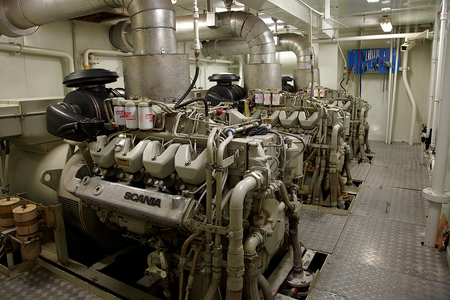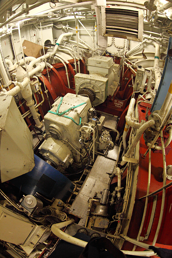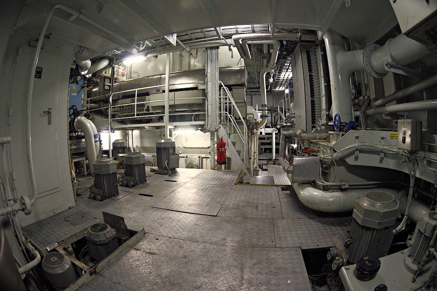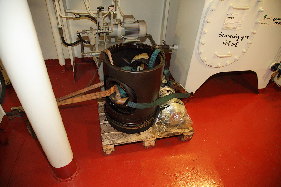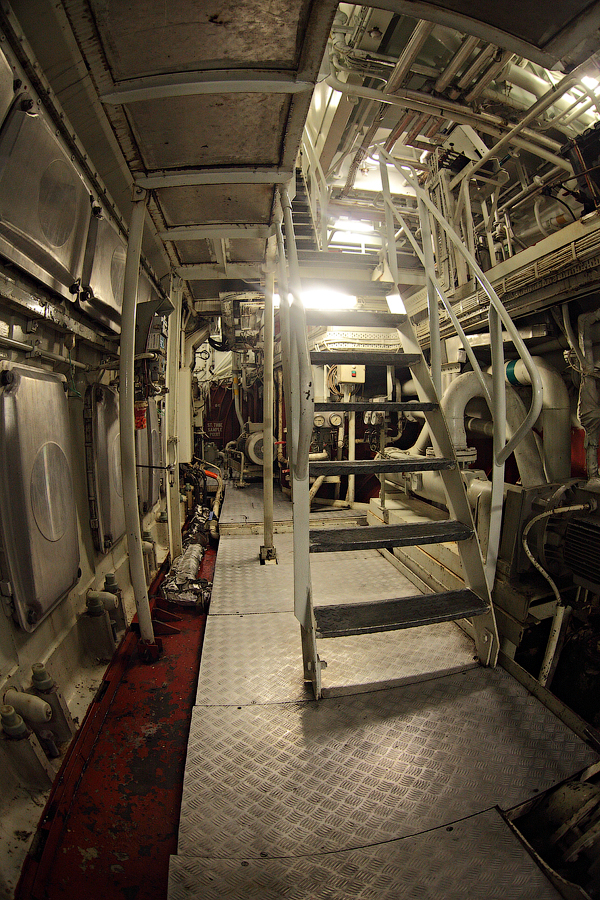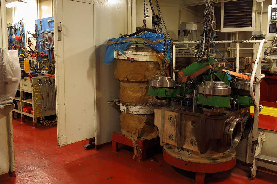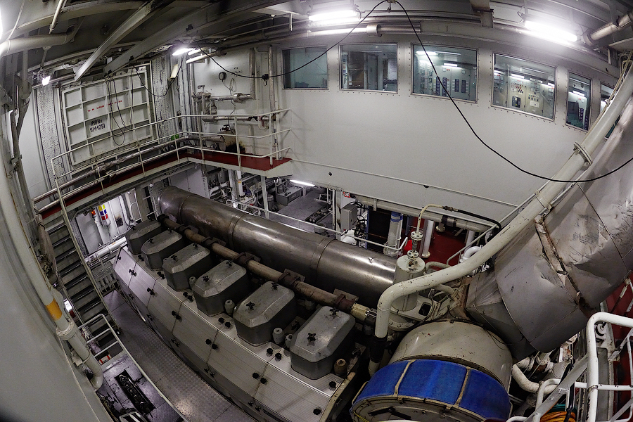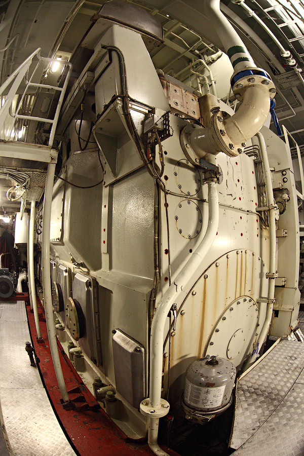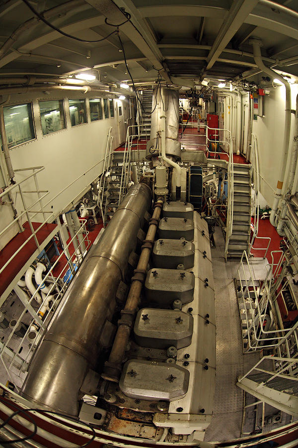 ....Продолжение..... Итак,друзья,в предыдущей серии мы с вами добрались до ЦПУ. Кстати,о кино.Если вы смотрели кинофильм "Посейдон",то должны помнить,каким эффектным способом добирался персонаж Курта Рассела до этого заветного места .Вкратце,напомню. Они там перевернули пароход вверх дном,а затем в течение часа плыли наверх,в машинное отделение,в ЦПУ,чтобы нажать на заветную Красную Кнопку для остановки Главного Двигателя (не один моряк сошел с ума во время просмотра этого фильма,от смеха ). Согласитесь,наш с вами маршрут в ЦПУ выглядел не так впечатляюще,но,что немаловажно,гораздо менее затратно . Ну а раз я вспомнил о кино,то нельзя умолчать о любимейшем фильме судомехаников.Это,безусловно,"Скорость-2". Скупые мужские слезы катятся по щекам судомехаников,когда они видят на экране,что таки есть на свете Главный Двигатель,который невозможно остановить!Hug. Мы втайне мечтаем о таком Двигателе (правда,Сандру Баллок пускать на судно мы в таком случае не будем,на фиг!) . Но,к сожалению,сценаристы кинофильма не спешат делиться секретными разработками с фирмами-производителями Двигателей,и нам пока приходится пользоваться вот этим: 97.Главный Двигатель ("Main Engine") 98. Шестицилиндровый двигатель Wärtsilä 6L46C мощностью 6300 кВатт . "Финский,хороший"(С) На приведенных фотографиях вы можете видеть только верхнюю половину Главного Двигателя. Увы,но производители Двигателей не идут навстречу пожеланиям фотографов,и не хотят производить таких двигателей,которые целиком помещались бы в кадр Чтобы помочь оценить масштабы Двигателя,покажу вам кое-какие детали от него. 99.Поршень Диаметр поршня-46 см,а высота-63 см 100.Шатун поршня Здесь легко сориентироваться в масштабе по высоте дверного проема,он чуть выше 2-х метров Поршни и втулки цилиндров меняем через каждые 20 000 часов.Крышки цилиндров-через 10 000 часов.Обычно эти работы выполняют работяги с берега.Насчет вспомогательных дизелей не могу сказать определенно. Да,мне говорили,что подобные двигатели устанавливают также на грузовиках ,но ни подтвердить,ни опровергнуть это информацию я не могу. 101. Цилиндровая втулка и крышка цилиндра Мы еще вернемся к Главному Двигателю,когда спустимся двумя этажами вниз . Ну а пока пройдемся по тому этажу,где у нас располагалось ЦПУ. Напротив ЦПУ,у нас располагается помещение дизель-генераторов. 101. Судовые дизель-генераторы,служат для обеспечения судна электропитанием.И таких дизель-генераторов у нас три штуки : 102. Когда судно стоит в порту,и идут грузовые операции, приходиться одновременно вводить в действие два дизель-генератора,для работы в параллельном режиме. Ну а когда судно в море,то....дизель-генераторы не работают.В чем тут подвох,спросите вы? Дело в том,что на судне имеется еще один генератор-это валогенератор,и подвешен он к валу Главного Двигателя. То-есть,работающий Главный Двигатель приводит в действие этот самый Валогенератор,и вырабатываемой им электроэнергии хватает с запасом. Ну а сам валогенератор мы увидим несколько позже,когда спустимся на нижний этаж машинного отделения. Продолжим экскурсию по этажу 103. 104. И вот,мы с вами подошли к такому важному механизму,как Рулевая Машина: 105.Рулевая Машина ("Steering Gear") 106. Рулевая Машина по своей сути-это гидравлическая установка,задача которой разворачивать на требуемый угол так называемый Баллер Руля. Ну а Баллер-это 