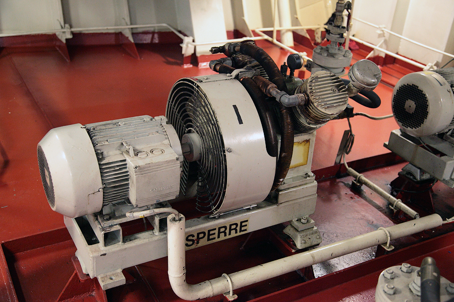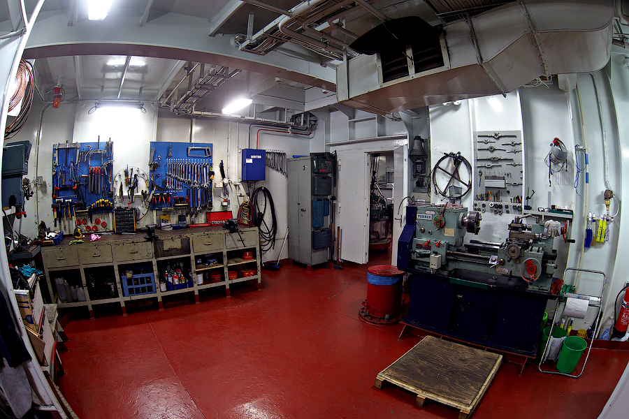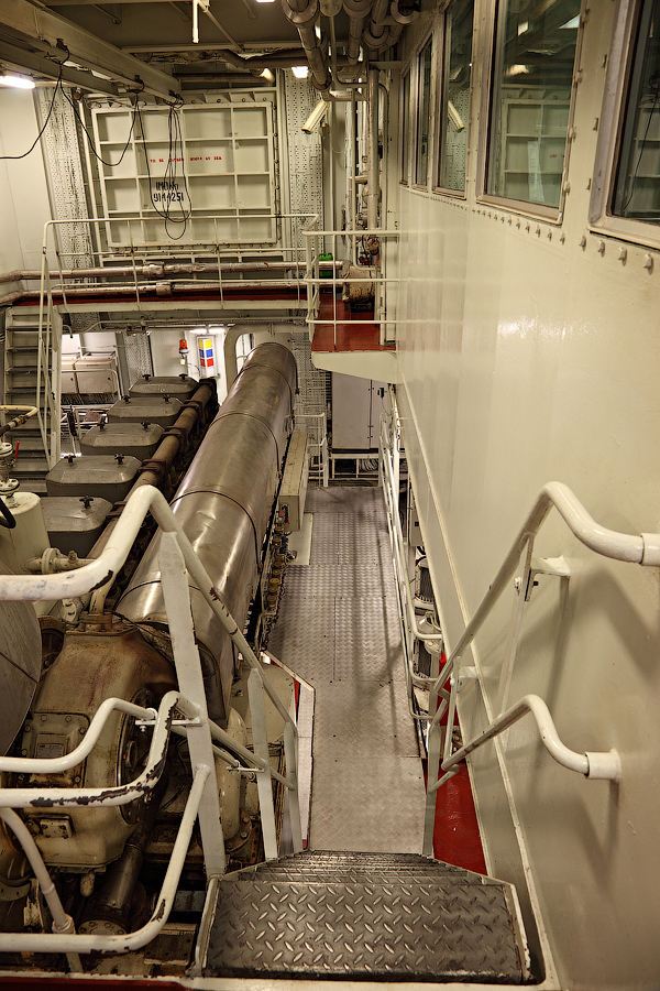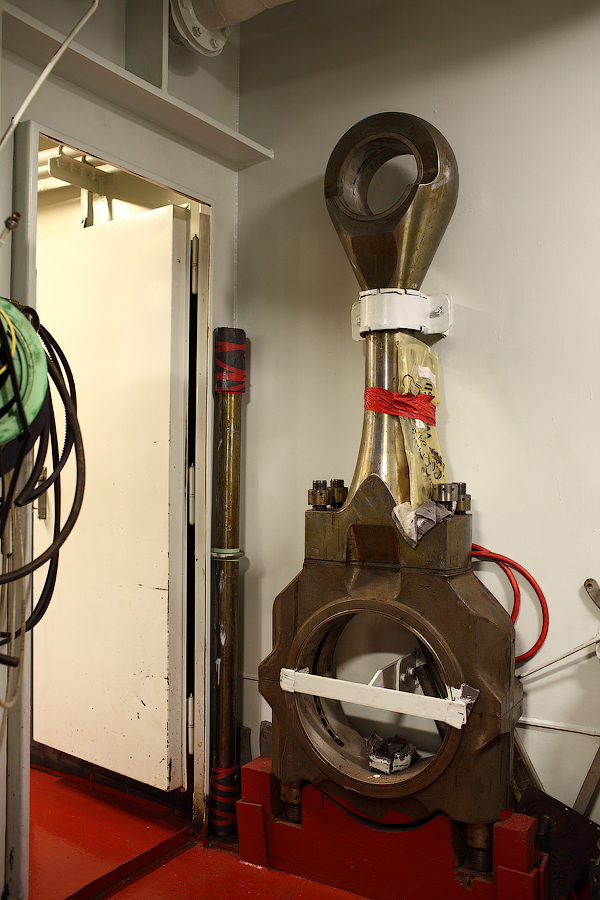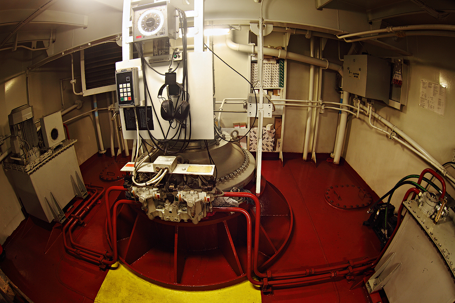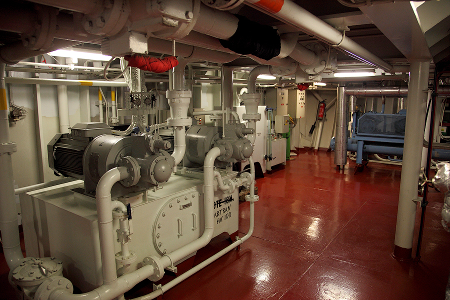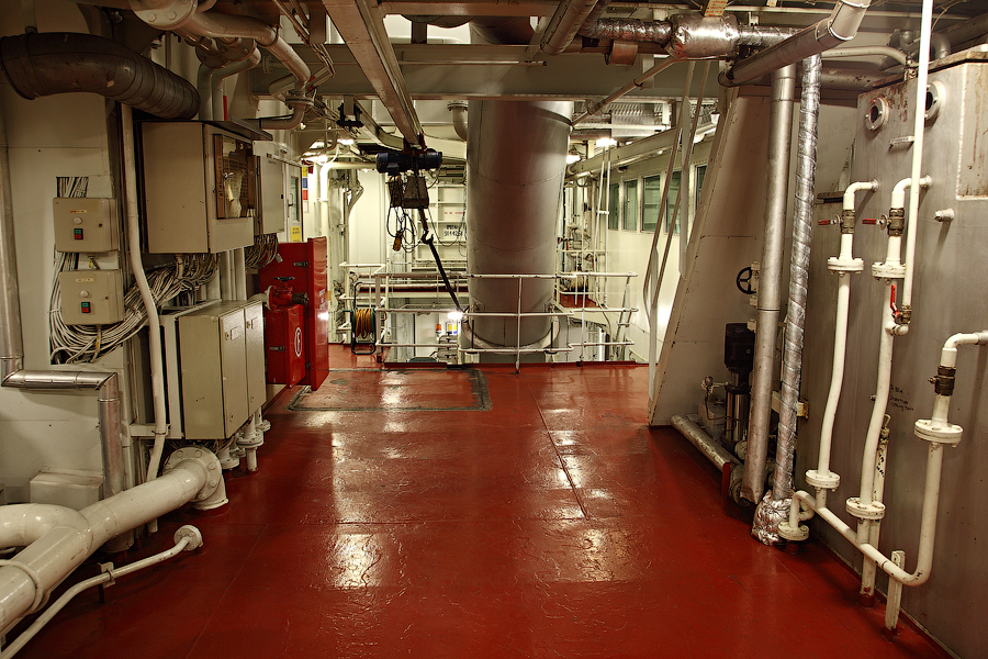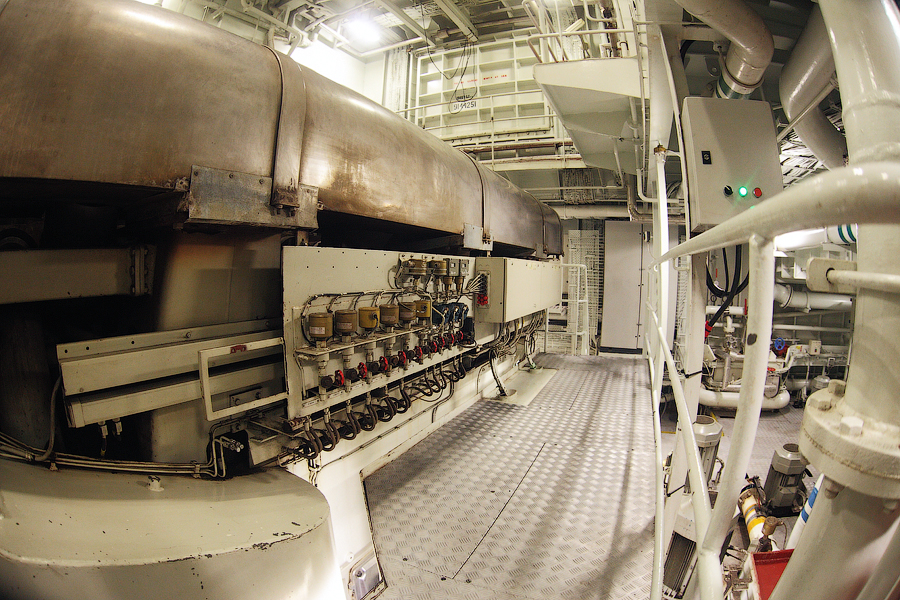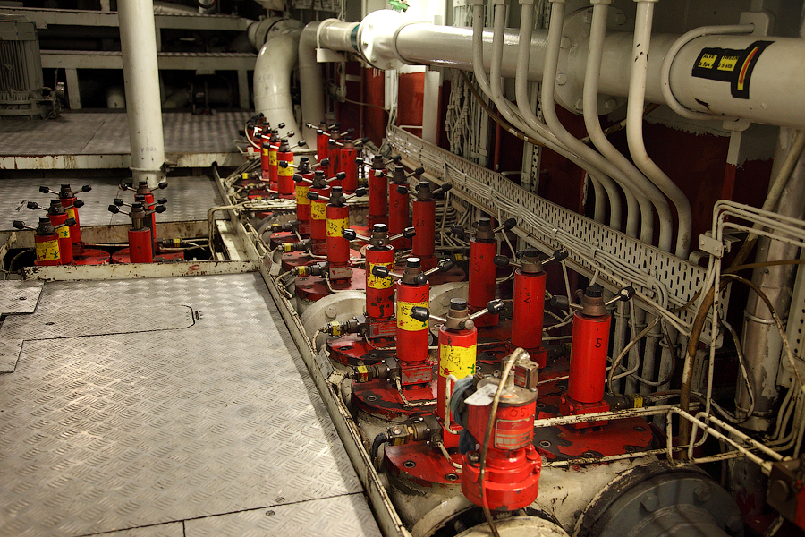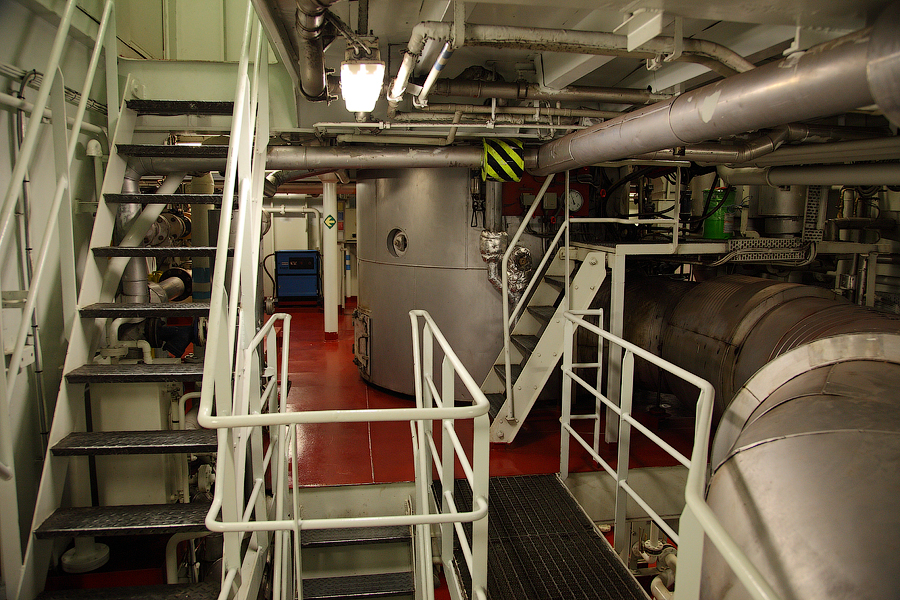 ....Продолжение..... Итак,друзья,в предыдущей серии мы с вами добрались до ЦПУ. Кстати,о кино.Если вы смотрели кинофильм "Посейдон",то должны помнить,каким эффектным способом добирался персонаж Курта Рассела до этого заветного места .Вкратце,напомню. Они там перевернули пароход вверх дном,а затем в течение часа плыли наверх,в машинное отделение,в ЦПУ,чтобы нажать на заветную Красную Кнопку для остановки Главного Двигателя (не один моряк сошел с ума во время просмотра этого фильма,от смеха ). Согласитесь,наш с вами маршрут в ЦПУ выглядел не так впечатляюще,но,что немаловажно,гораздо менее затратно . Ну а раз я вспомнил о кино,то нельзя умолчать о любимейшем фильме судомехаников.Это,безусловно,"Скорость-2". Скупые мужские слезы катятся по щекам судомехаников,когда они видят на экране,что таки есть на свете Главный Двигатель,который невозможно остановить!Hug. Мы втайне мечтаем о таком Двигателе (правда,Сандру Баллок пускать на судно мы в таком случае не будем,на фиг!) . Но,к сожалению,сценаристы кинофильма не спешат делиться секретными разработками с фирмами-производителями Двигателей,и нам пока приходится пользоваться вот этим: 97.Главный Двигатель ("Main Engine") 98. Шестицилиндровый двигатель Wärtsilä 6L46C мощностью 6300 кВатт . "Финский,хороший"(С) На приведенных фотографиях вы можете видеть только верхнюю половину Главного Двигателя. Увы,но производители Двигателей не идут навстречу пожеланиям фотографов,и не хотят производить таких двигателей,которые целиком помещались бы в кадр Чтобы помочь оценить масштабы Двигателя,покажу вам кое-какие детали от него. 99.Поршень Диаметр поршня-46 см,а высота-63 см 100.Шатун поршня Здесь легко сориентироваться в масштабе по высоте дверного проема,он чуть выше 2-х метров Поршни и втулки цилиндров меняем через каждые 20 000 часов.Крышки цилиндров-через 10 000 часов.Обычно эти работы выполняют работяги с берега.Насчет вспомогательных дизелей не могу сказать определенно. Да,мне говорили,что подобные двигатели устанавливают также на грузовиках ,но ни подтвердить,ни опровергнуть это информацию я не могу. 101. Цилиндровая втулка и крышка цилиндра Мы еще вернемся к Главному Двигателю,когда спустимся двумя этажами вниз . Ну а пока пройдемся по тому этажу,где у нас располагалось ЦПУ. Напротив ЦПУ,у нас располагается помещение дизель-генераторов. 101. Судовые дизель-генераторы,служат для обеспечения судна электропитанием.И таких дизель-генераторов у нас три штуки : 102. Когда судно стоит в порту,и идут грузовые операции, приходиться одновременно вводить в действие два дизель-генератора,для работы в параллельном режиме. Ну а когда судно в море,то....дизель-генераторы не работают.В чем тут подвох,спросите вы? Дело в том,что на судне имеется еще один генератор-это валогенератор,и подвешен он к валу Главного Двигателя. То-есть,работающий Главный Двигатель приводит в действие этот самый Валогенератор,и вырабатываемой им электроэнергии хватает с запасом. Ну а сам валогенератор мы увидим несколько позже,когда спустимся на нижний этаж машинного отделения. Продолжим экскурсию по этажу 103. 104. И вот,мы с вами подошли к такому важному механизму,как Рулевая Машина: 105.Рулевая Машина ("Steering Gear") 106. Рулевая Машина по своей сути-это гидравлическая установка,задача которой разворачивать на требуемый угол так называемый Баллер Руля. Ну а Баллер-это 