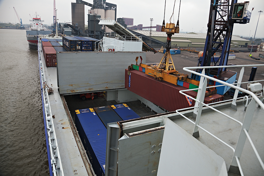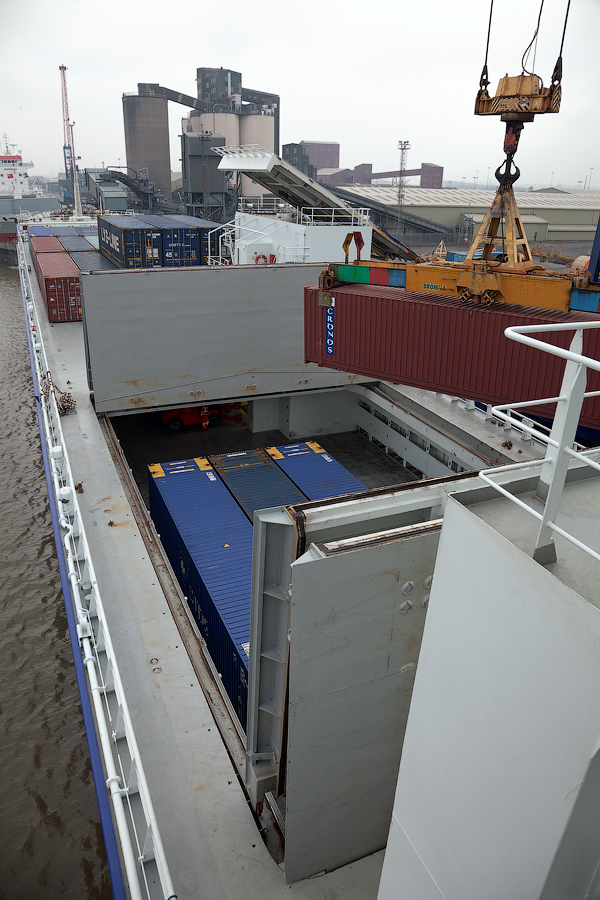Если грузовые отсеки не заполнены рулонами бумаги полностью,то можно загрузить контейнеры непосредственно в твиндек. Чтобы поместить контейнеры в твиндек,необходимо открывать крышки грузового отсека. Крышки,с помощью гидравлики, становятся "домиком" и открывается доступ в твиндек. После чего береговой кран может опускать туда контейнер: