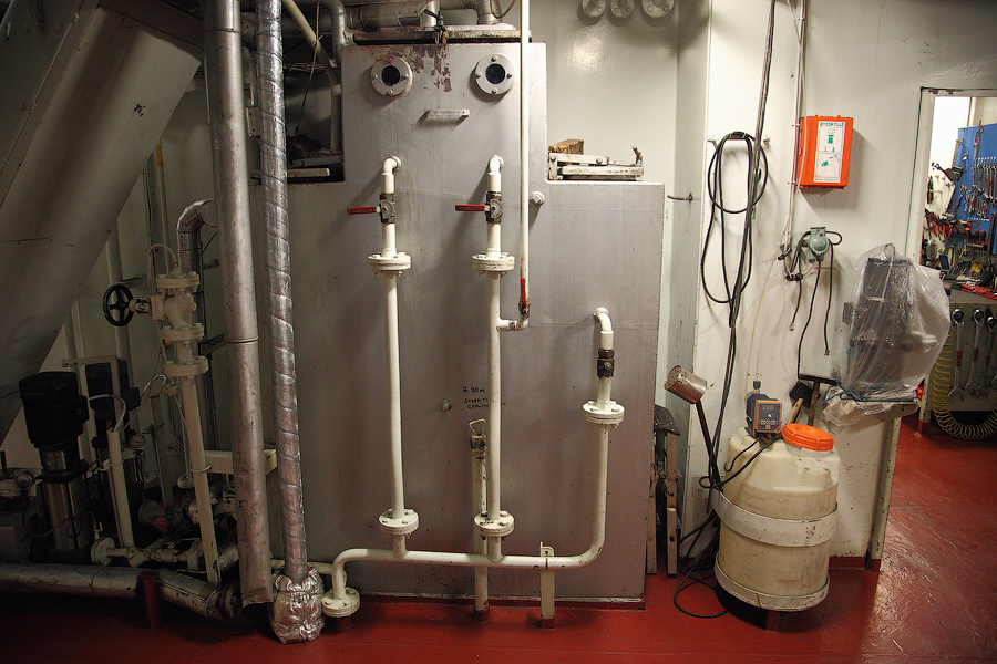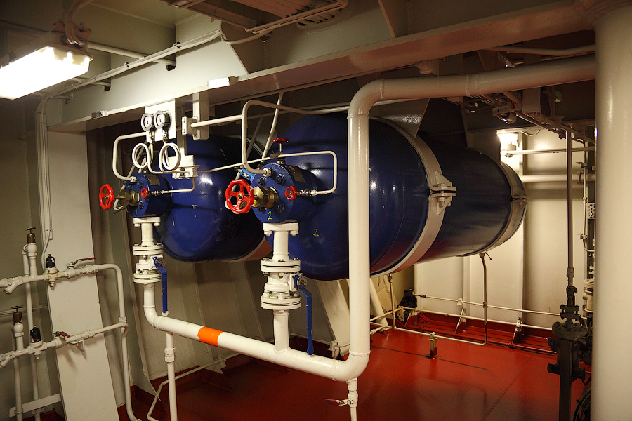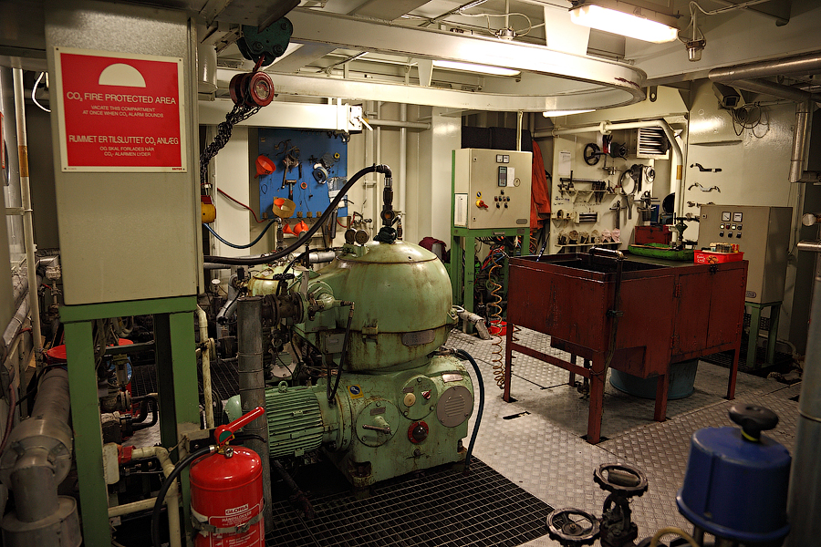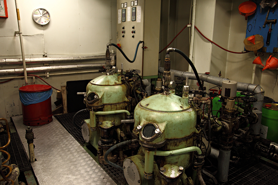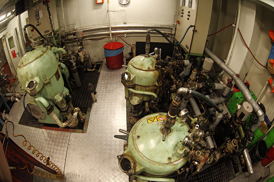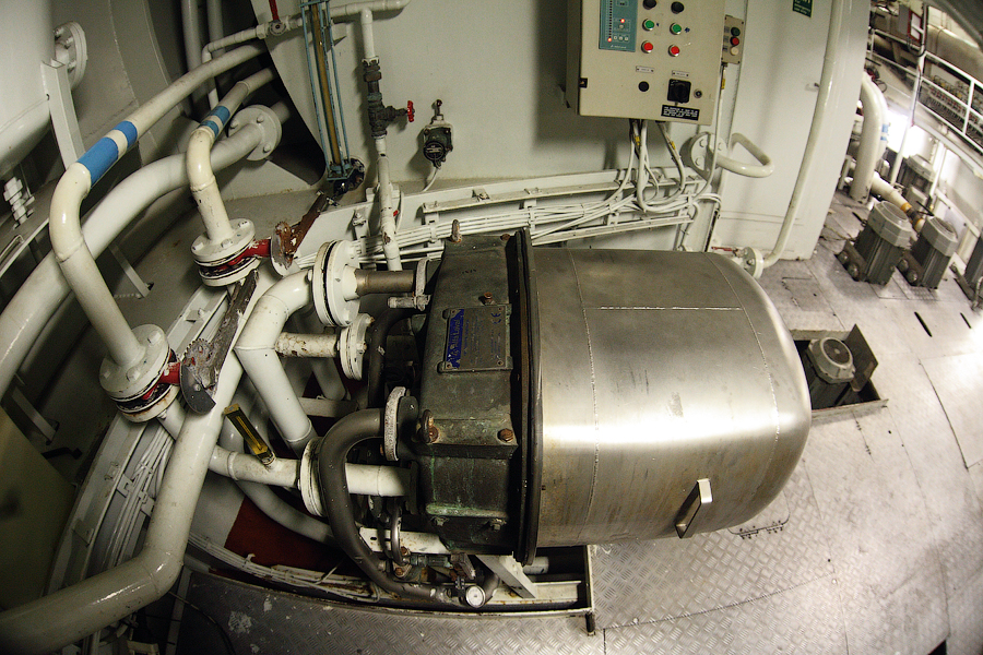 ........Продолжение........ Итак,друзья,после продолжительного перерыва,вызванного всякого рода катаклизмами,мы будем с вами выбираться из машинного отделения,в котором с вами "застряли" в прошлый раз. Выбираться мы с вами будем,как настоящие герои,в обход . Ну а всем героям полагается бонус.Будет он и у вас. Вы,наконец,увидите то,о чем много раз слышали,-это будет так называемый "Свет в конце тоннеля"! Рядом с помещением дизель-генераторов располагается Сепараторная Комната (Separators Room): 111.Помещение сепараторов Очень важное во всех смыслах для нас,механиков,помещение. Можно даже сказать,что это помещение для нас-словно дополнительная мастерская.Видите коричнево-красный стол посередине помещения? Это-мойка . Там мы,с помощью солярки,постоянно что-нибудь да моем . Чаще всего,в этой мойке отмываются от мазута и шлама детали сепараторов. Но,как вы понимаете,в машинном отделении найдется предостаточно деталей,требующих подобного ухода. И вот это все несется сюда и моется-моется-моется .Если вы попросите механика дома помыть посуду,то он вам ее вымоет так,как никто на свете .Но....В районе двух-трех метров от мойки,все будет забрызгано с верху до низу .Что ж тут поделаешь,профессиональная болезнь,однако Я думаю,многие в курсе,что столь любимые нами молочные продукты производят с помощью центробежных сепараторов.И те сепараторы,что используются на судах,по сути своей братья-близнецы с молочными сепараторами ....Но вот сепарируемая жидкость отличается кардинально 112.Сепараторы На снимке большой сепаратор-это сепаратор масла Главного Двигателя. Масло главного двигателя имеет довольно высокое "щелочное число" (от слова-щелочь ). А если вы в детстве,в перерывах между хулиганством и игрой в футбол,посещали уроки химии,то должны помнить,какими свойствами обладает щелочь. Правильно,моющими То-есть,наше масло не только смазывает (и охлаждает) трущиеся детали главного двигателя,но и вымывает продукты сгорания топлива,скапливающиеся на стенках цилиндровых втулок и т.д. Вся эта грязь,скапливающаяся в смазочном масле,частично оседает в масляных фильтрах. Но,главную нагрузку по очистке масла выполняет как раз-таки масляный сепаратор. Поэтому,этот сепаратор у нас работает постоянно-чем чище масло,тем меньше будет проблем у механиков 113. Ну а сепараторы поменьше-это топливные сепараторы.Они очищают мазут от воды (в первую очередь) и от тяжелых фракций в топливе. Откуда берется вода в топливе? Ну,думаю,все в курсе того,что поставщики топлива не брезгуют разбавлять его ослиной мочой водичкой .Но для нас (тьфу-тьфу-тьфу) такие махинации не очень актуальны .А вода в топливе появляется по естественным причинам-от высоких перепадов температур в топливных танках образуется конденсат.И вот эту вот влагу обязательно нужно отсепарировать от топлива,иначе топливной аппаратуре придет большой-большой кирдык Скажем,вот этим вот форсункам Главного Двигателя: 114.Форсунки Главного Двигателя Перед тем,как продолжить наше с вами поступательное движение вниз,осмотримся,не пропустили ли мы с вами еще чего-нибудь интересненького на этом этаже. Ну вот,к примеру,есть тут у нас так называемый Теплый Ящик (Hot Well): 115.Теплый Ящик В этом Теплом Ящике собирается конденсат от паровых магистралей. И уже отсюда идет пополнение парового котла (с которым мы уже познакомились раньше) водо