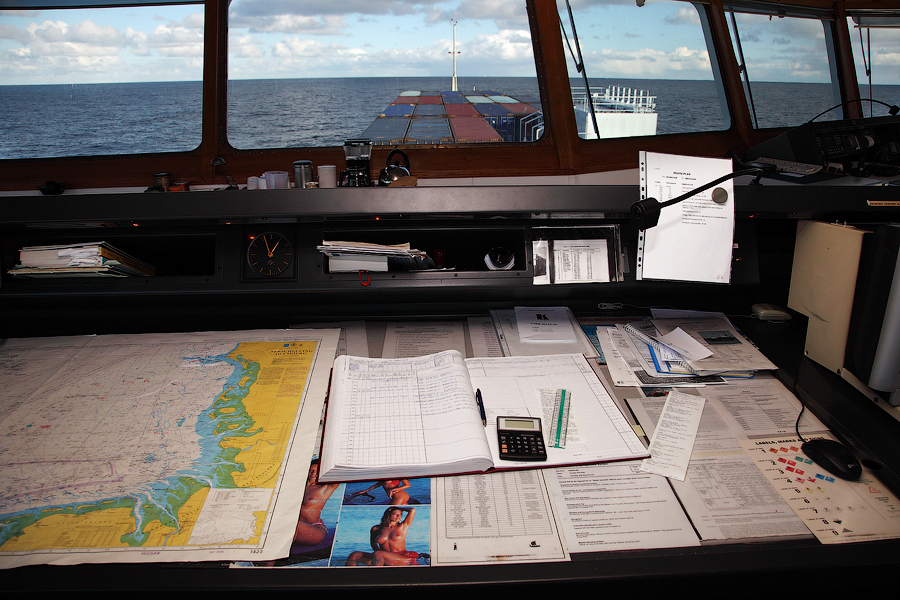 И вот,судно стоит в порту. Обычно,в это время Капитанский Мостик пустует. Но мне очень хотелось показать вам,как выглядит Человек на Мостике