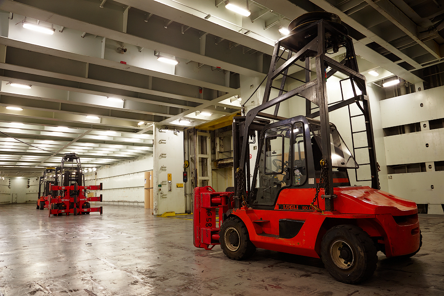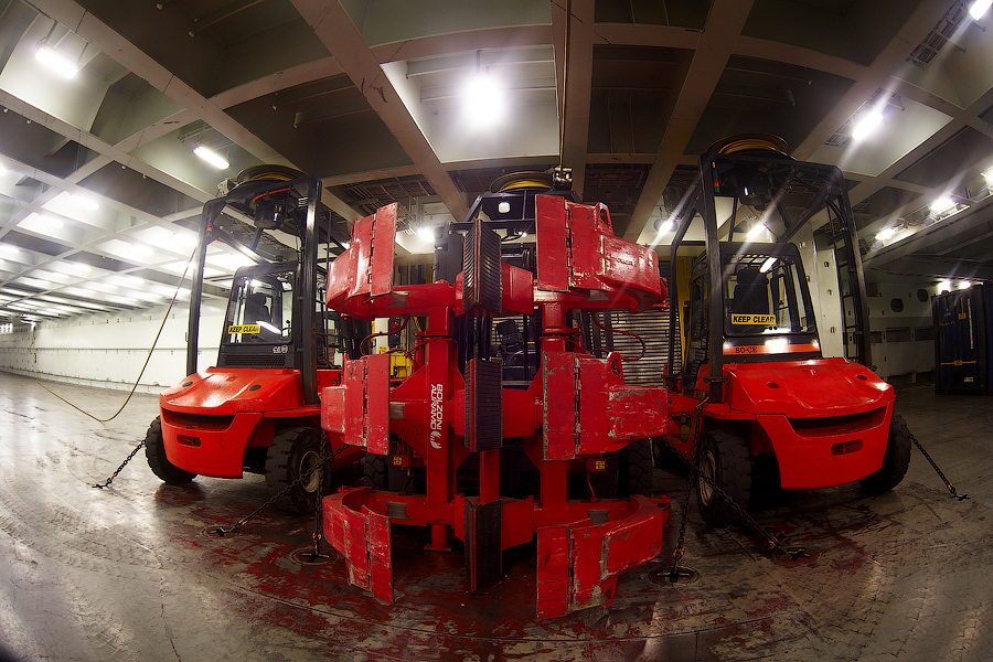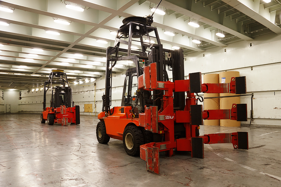 Для того,чтобы передвигать рулоны бумаги непосредственно в грузовых помещениях,на судне имеются шесть штатных погрузчиков (forklifts,в дальнейшем-форклифты). Три в твиндеке,и три в трюме.Вот так вот выглядят эти красавцы:
