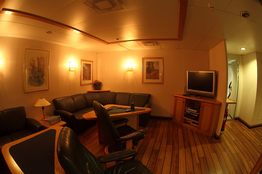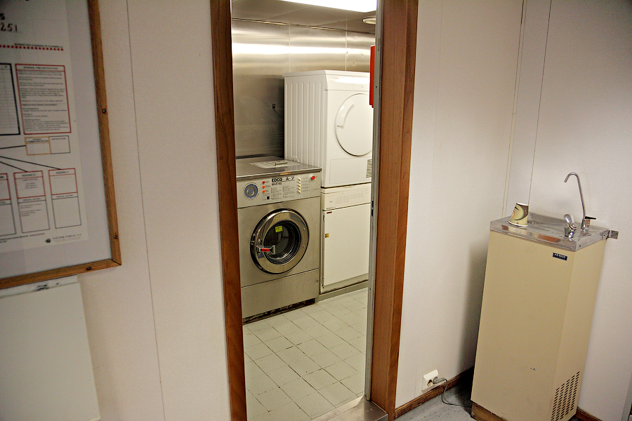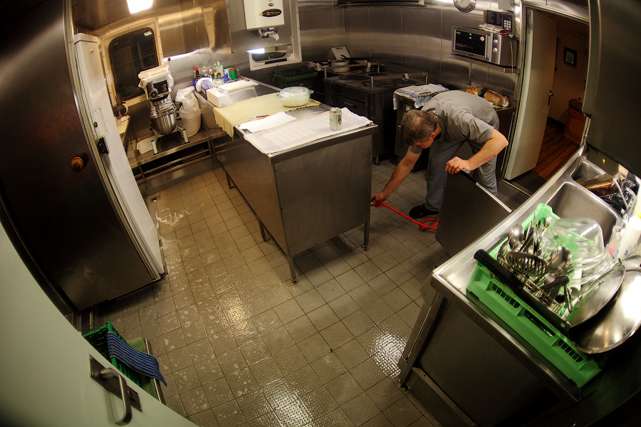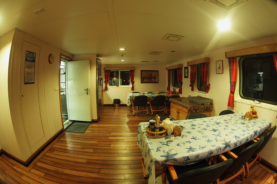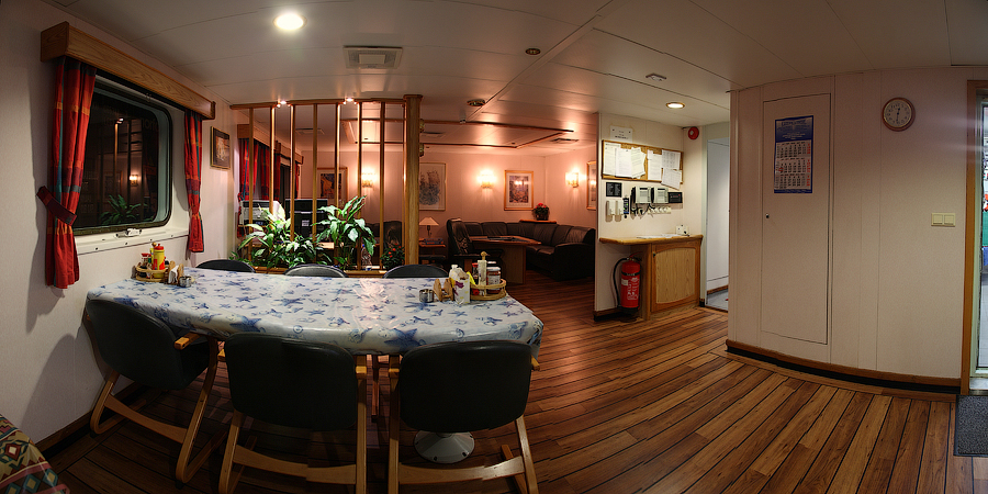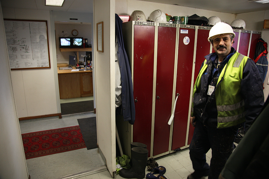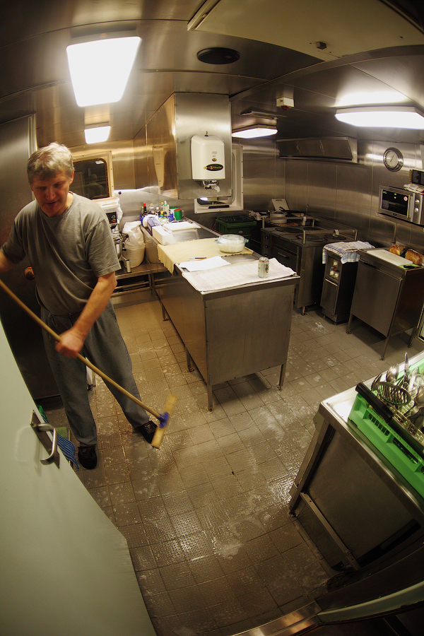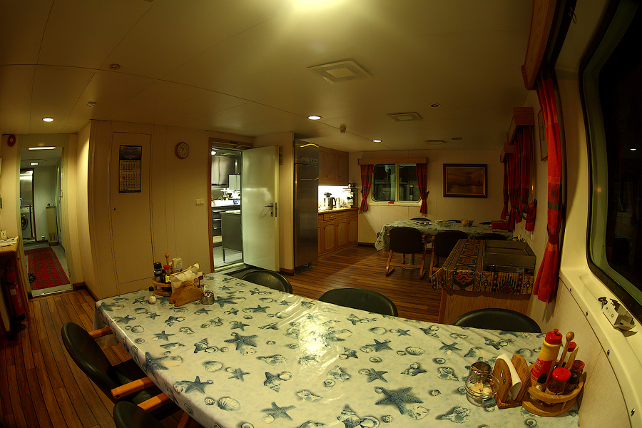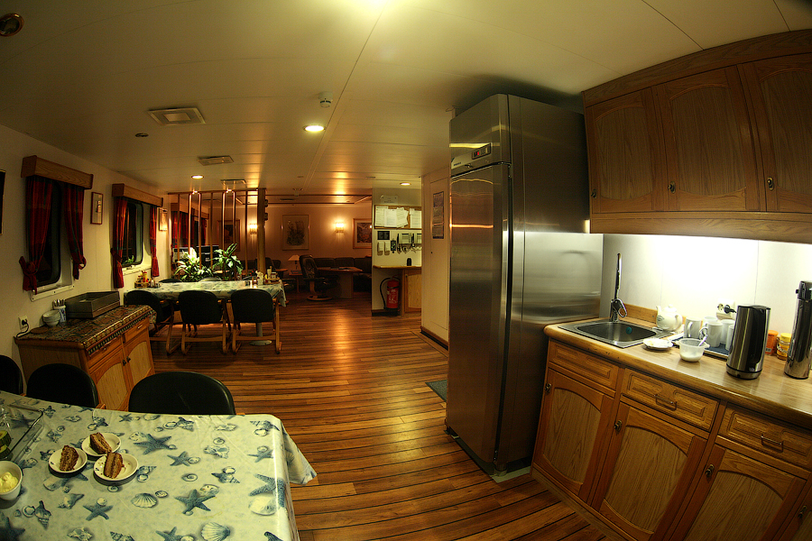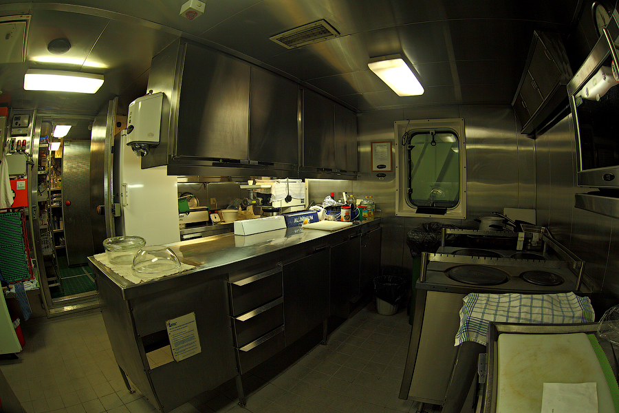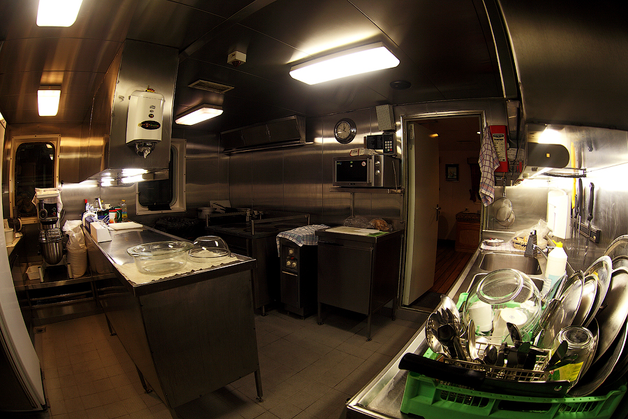 ....Продолжение..... Я думаю,вы уже догадались,что будет там,за поворотом направо. Да,ребята,там у нас будет камбуз и кают-компания . Но,должен вас предупредить. Перед тем,как зайти в любое жилое помещение,вам придется снять обувь.Да,есть такая морская традиция.Идешь ли ты в каюту, или на камбуз,или в кают-компанию,всегда снимай перед входом тапочки.От этой привычки я не могу избавиться даже дома.По инерции,сбрасываю тапочки перед входом в комнату . 66. 67. Итак,по левую руку от нас будет Камбуз (он же "Galley"),ну а прямо по курсу-Кают-компания (она же "Messroom"). Стоящие перед кают-компанией тапочки указывают нам на то,что в помещении кто-то есть .И я даже знаю,кто именно Вот так вот,по тапочкам,мы можем идентифицировать членов экипажа Заглянем для начала на камбуз: 68.Камбуз 69. На дальнем плане виднеются смежные камбузу помещения-это так называемые провизионные камеры. Именно там хранится всякая вкуснятина .В плане питания на судне у нас-полная демократия . В любой момент можно свободно зайти туда,и выбрать себе необходимое утоляющее голод (и скуку) средство . Положа руку на сердце,кок-самая неблагодарная морская профессия. Очень трудно,да практически невозможно угодить всем.Капризничают морячки на судне в плане покушать,ох как капризничают! Ну а коку(морское прозвище "Coockie" ),приходится помимо готовки пищи,наводить марафет в каютах капитана,старпома и стармеха. Но я вот категорически отказался от такой "услуги",ибо это выше моего понимания-как это чужой человек будет прибираться в моих хоромах???Shocked.Брррр Ну и,естественно,повару приходится содержать свое рабочее место в чистоте: 70. 71. Ну а теперь пройдем с вами в кают компанию: 72. 73. 74. 75. 76. 77. Самый дальник столик в кают-компании является нашим излюбленным местом для "кофетаймов" .И кофеварка под боком,и холодильник на расстоянии вытянутой руки . Ну а если нам захочется телевизор посмотреть,то мы,вместе с закуской и бокалами коньяка,перебираемся на уютные кожаные диваны и кресла Но,в последнее время,экипаж собирается по вечерам в салоне все реже и реже.Ибо,практически у каждого теперь имеется свой собственный ноутбук,и моряки чаще предпочитают в свободное время спрятаться в свои "норы",то-есть в каюты, и торчать часами в интернете Что касается именно нашего судна,то немаловажным фактом является то,что судно было спроектировано норвежцами и для норвежцев же было построено. Отсюда и высокий уровень комфорта.Ибо,норвежцы очень щепетильно относятся к тому,в какой обстановке им предстоит жить и работать .Молодцы,чего уж там,такому отношению к самим себе нам у них поучиться стоит. Любого моряка,впервые попадающего к нам на судно,в первую очередь поражает не столько грамотная планировка помещений,сколько то,чем это все обставлено . Скажем,зеленые диваны и кресла,которые ты мог видеть на фотографиях,-это просто сказка!Такой качественно мебели я нигде больше не видел. И норвежцы с гордостью говорят,что эту мебель заказывали у самой престижной и дорогой компании в Норвегии. То-есть,ребята на комфорте не экономят,и нам это по душе! То же самое и с провизией. Норвежцы считают,что на судне питание должно быть не хуже,чем в ресторане .И не дай бог судовладелец попытается на этом деле сэкономить,сразу же разразится грандиозный скандал . То-есть,все банально.Если ты сам себя уважаешь,и требуешь к себе уважение и от рабо