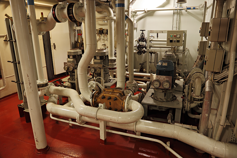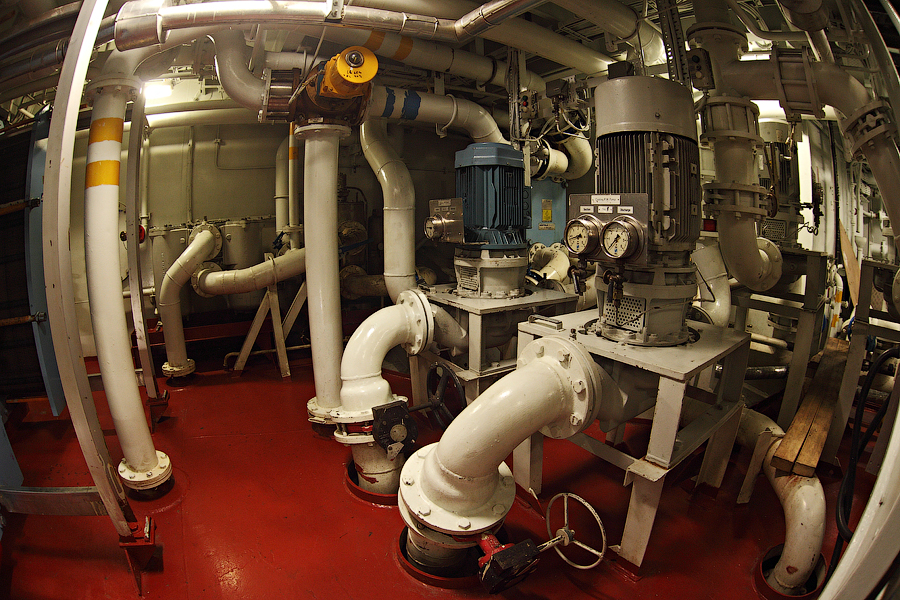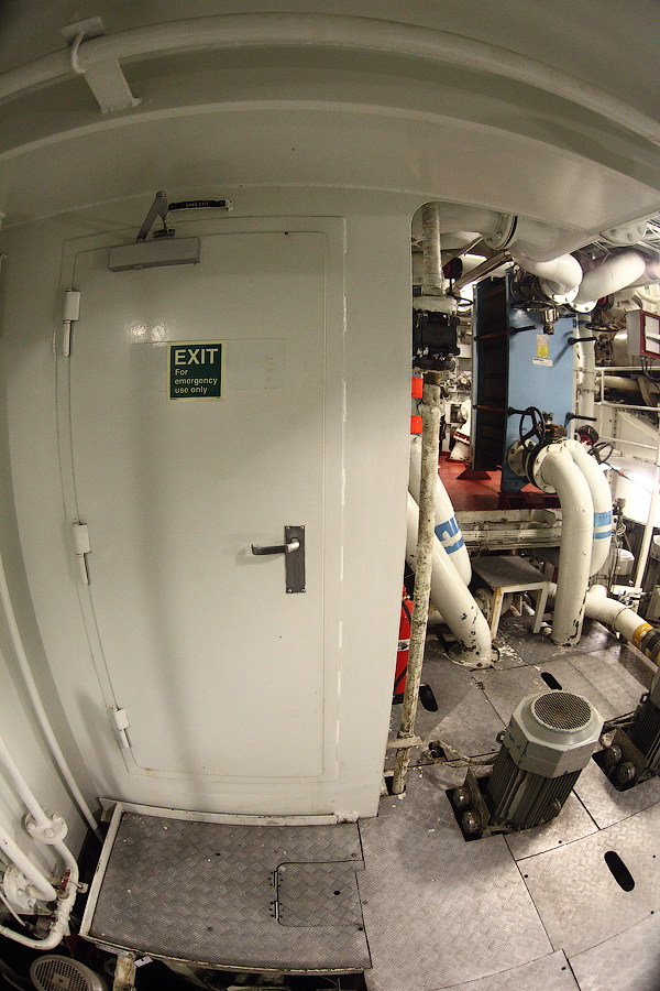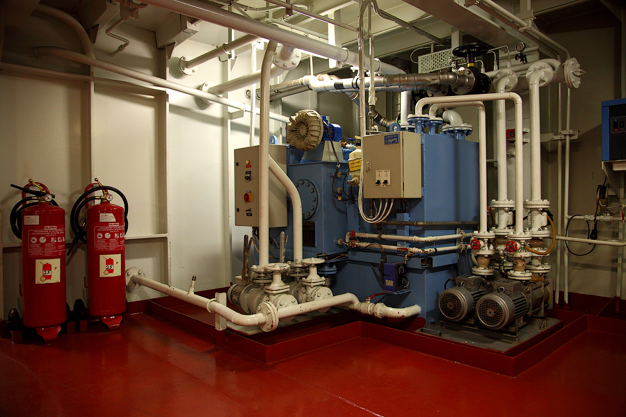.....Продолжение..... Сепаратор Льяльных Вод-это то,что мешает нам,механикам,жить . Этот объект придуман специально для того,чтобы механикам смогли потрепать нервы всякие береговые тунеядцы,устраивающие проверки судна в портах.В частности такая ненавидимая всеми моряками организация,как Port State Control. Механик может сутками не вылезать из машинного отделения,ремонтируя самые важные механизмы. А потом,в порту,приходят эти вот уроды в накрахмаленных чистеньких комбинезончиках,и ясно тебе дают понять,что нет на пароходе объекта важнее,чем Сепаратор Льяльных Вод . И если,не дай бог,при проверке этот Сепаратор закапризничает,то стармеху будут обеспечены крупные неприятности.Что ж это за страшный зверь такой,этот Сепаратор? Понятно,что в машинном отделении случаются всякого рода протечки.Это может быть и вода,и масло,и топливо. Все эти протечки скапливаются в колодцах льял машинного отделения (по-простому,это дно машинного отделения,под плитами ).Затем,эти протечки откатываются насосом в танк для сбора льяльных вод. Естественен вопрос-а что делать с этими протечками дальше? Один из способов-это сдавать в порту на специальную баржу (или машину) все эти накопившиеся "грязные" льяльные воды. Второй способ-откатывать за борт. Но,естественно,просто так за борт грязную воду откатывать нельзя,ее нужно предварительно очистить. Вот для такой очистки и нужен Сепаратор Льяльных Вод. Всякими морскими конвенциями строго регламентируется и требуемая степень очищенности такой вот откачиваемой воды,и морские районы-где можно и нельзя делать откатку вод за борт и прочее....В-общем,друзья,понапринимали кучу всяких конвенций,и теперь у Port State Control появилась прямо-таки масса возможностей изнасиловать ранимую душу старшего механика. Поэтому,мы с презрением пройдем мимо этого Сепаратора,и снова окажемся на нижнем этаже машинного отделения 129. 130. В моих предыдущих постах я уже упоминал о таких агрегатах,как Валогенератор и Главный Редуктор. Теперь пришло время показать вам эти механизмы. Правда,друзья,сейчас у нас там ведутся ремонтные работы,и поэтому вид не слишком презентабельный 131.Главный Редуктор и Валогенератор Слева,под синим кожухом,виднеется муфта,соединяющая вал Главного Двигателя и вал Главного Редуктора (Main Gear).Вал Главного двигателя у наc вращается с частотой 500 оборотов в минуту. Ну а задача Редуктора - передавать момент вращения, и изменять частоту вращения до 130 оборотов в минуту(это расчетная оптимальная частота вращения, необходимая для нормальной работы гребного винта).Видите,под плитами виднеется участок вала? Вот это и есть уже гребной вал,с частотой вращения в 130 об.в минуту. Ну а справа от Редуктора-это Валогенератор. И он у нас сейчас отсоединен и временно не эксплуатируется Когда получим нужную запчасть,то соединим Валогенератор и Редуктор с помощью приводного вала. И тогда,при работе Главного Двигателя, Валогенератор будет производить электроэнергиюSmile 132. 133. Ну вот и пришло время,друзья,покинуть нам с вами гостеприимное машинное отделение. Вы уже успели устать от шума и запаха топлива? Поверьте,механики прекрасно понимают ваши чувства и разделяют их . Ну а покидать машинное отделение мы будем ,друзья,через Аварийный Выход: 134. 135. Открыв дверь,мы понимаем,что нас там ждали : Но ждали нас тут не очень-то здоровых,а ...слегка травмир