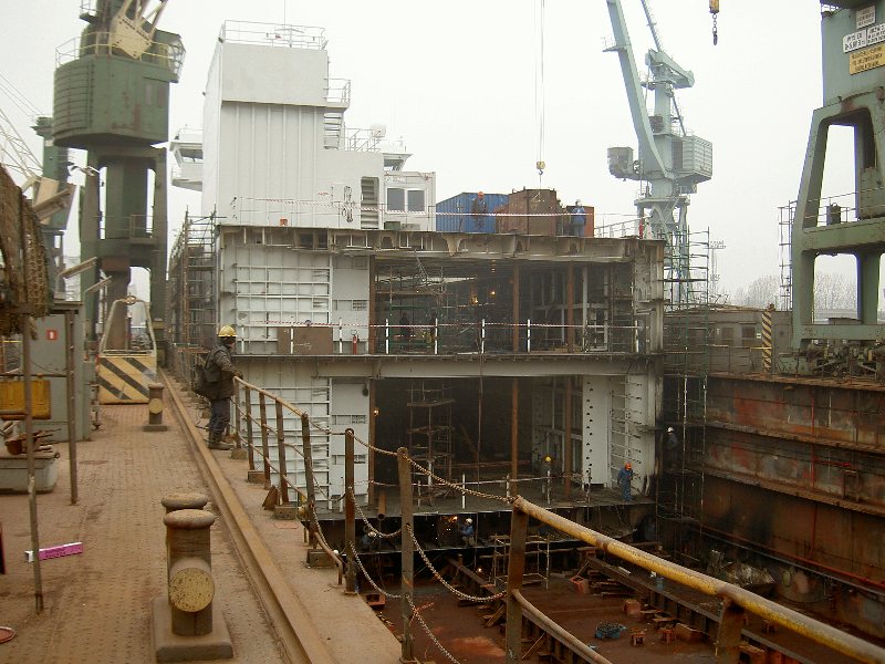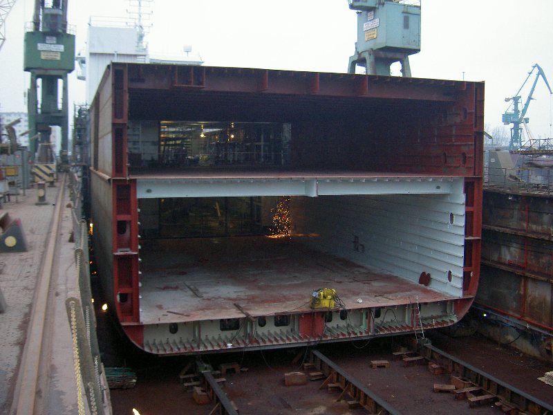 Наше судно было спроектировано и построено специально для перевозки такого специфичного груза,как бумага.А точнее-рулонов бумаги.Отсюда и некоторые особенности в конструкции судна.Так,по правому борту судна имеется аппарель и грузовой лифт,с помощью которого и происходит непосредственная загрузка или выгрузка рулонов бумаги.Грузовых отсеков на судне два-это непосредственно грузовой трюм и твиндек.Образно говоря,единое пространство грузового отсека разделено на два этажа,верхний из которых-твиндек,а нижний-грузовой трюм.Чтобы вы лучше себе представили,как это выглядит,покажу вам фотографии,сделанные во время такого чудного процесса,как"удлинение" судна.Да-да,пароходы иногда подвергаются пластическим операциям