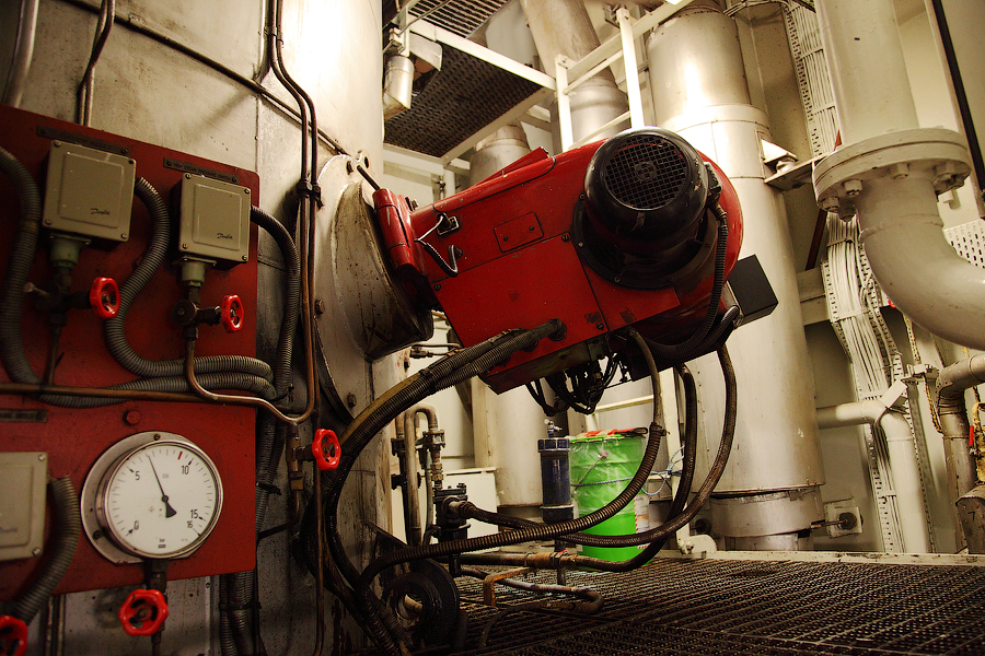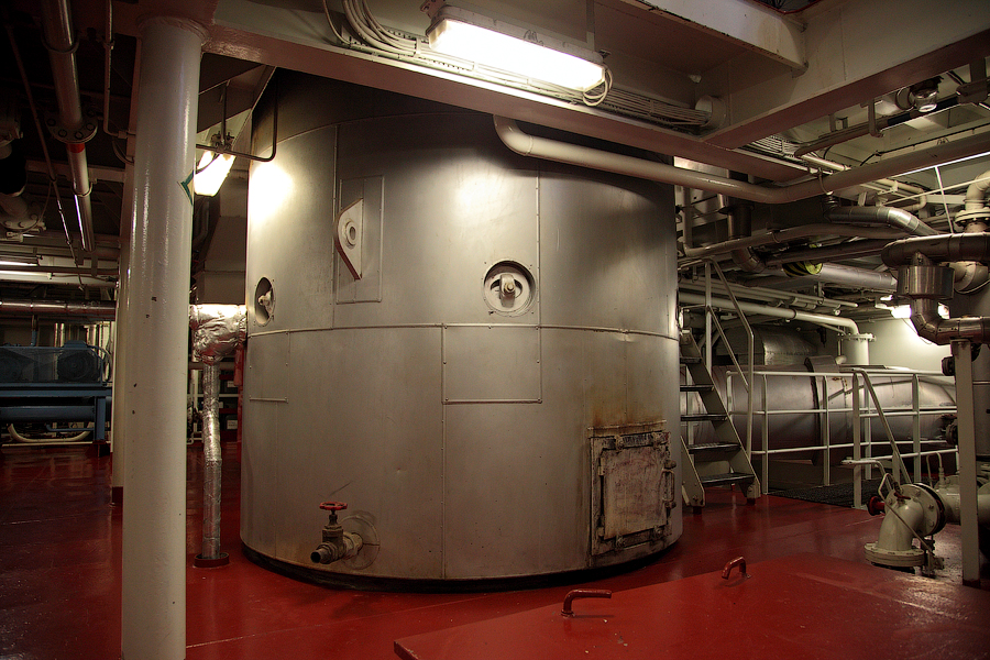 ......Продолжение.... Глава 5. "Темное царство" "Эй, в машине, пустите машины в раздрай!. Эй, в машине!!! В машине: - Что в машине? Я всю жизнь в машине. Я никогда не знаю, куда мы идем. У меня такое впечатление, что на мостике все курвы. Хорошо. Они наверху. Они командуют. Я выполню любой приказ мгновенно, но пусть они мне сначала докажут. Ты, командир, докажи, что ты умней, и все, и мы уже идем. " (М.Жванецкий "Одесский пароход") Итак,друзья,после непродолжительного отдыха,мы с вами,набравшись сил, попробуем спуститься в "темное царство",в "машинное отделение". Чтобы чувствовать себя комфортно,мы с вами наденем наушники,ибо царство наше не только темное,но и шумное . В предыдущей главе я уже показывал вам ту заветную дверь,за которой скрывалось машинное отделение.И вот пришла пора эту дверь приоткрыть.Далее,нам предстоит спуститься вот по этому трапу: 78. Врата в адское пекло Понятно,что вы долго ждали этой экскурсии,и вам хочется как можно быстрее рвануть вниз . Но,мы не будем поддаваться чувствам,а спустимся медленно и аккуратно,внимательнейшим образом глядя себе под ноги. Если,не дай бог,на ступеньке трапа окажется капелька масла,то...вы скатитесь по трапу на попе быстрее,чем осознаете,что это было Итак,спустились аккуратно по трапу,и видим такую картину: 79. Надувшись от важности,нас встречает Паровой котел ...А как тут не надуться,если в него запихнули целых десять кубометров воды? И предназначение котла-вскипятить эту воду до состояния пара,причем пара высокого давления.Видите,по правую руку,идет большая-большая серебристая труба,которая входит в котел? Это выхлопная труба главного двигателя. Когда Главный двигатель работает,то выхлопные газы ,проходя через котел,доводят воду в котле до кипения,и мы на халяву получаем необходимый пар . Не зря Котел имеет приставку "утилизационный",так как он фактически утилизирует выхлопные газы Главного Двигателя 80. Для чего нам,собственно,нужен пар на судне? В-основном,для подогрева тяжелого топлива (мазута),на котором работает Главный Двигатель. При каких-то 20-ти градусах по Цельсию такое топливо превращается в смолу,и никакая топливная аппаратура с такой смолой не справится.И,чтобы Главный Двигатель смог работать на мазуте,топливо необходимо прогревать аж до 120 градусов по Цельсию. Когда судно стоит в порту,то Главный Двигатель,естественно,не работает. Значит,мы лишены возможности использовать выхлопные газы для производства пара в котле. В таких случаях на котле запускается его собственная горелка(форсунка): 81. Задача этой горелки-создать внутри топки котла мощный факел,который и будет греть воду до кипения. Горелка подает в топку котла мощную струю распыленного топлива.В момент запуска горелки, два специальных электрода горелки вырабатывают "искру" и топливо воспламеняется. И тут приходится сказать о грустных вещах. Периодически на судах случается такая страшная вещь,как "взрыв котла". CryПроисходит это тогда,когда по каким-то причинам ,перед запуском горелки,топка котла не была хорошо провентилирована. А в это время,опять-таки по разным причинам,в топке котла скопилось не сгоревшее топливо и образовались взрывоопасные газы. Вы запускаете горелку,даете искру и ...бум! CryВ корпусе горелки есть вентилятор. И чтобы избежать подобного взрыва,он,перед подачей топлива,в течение минуты вентилирует топку котла,уд