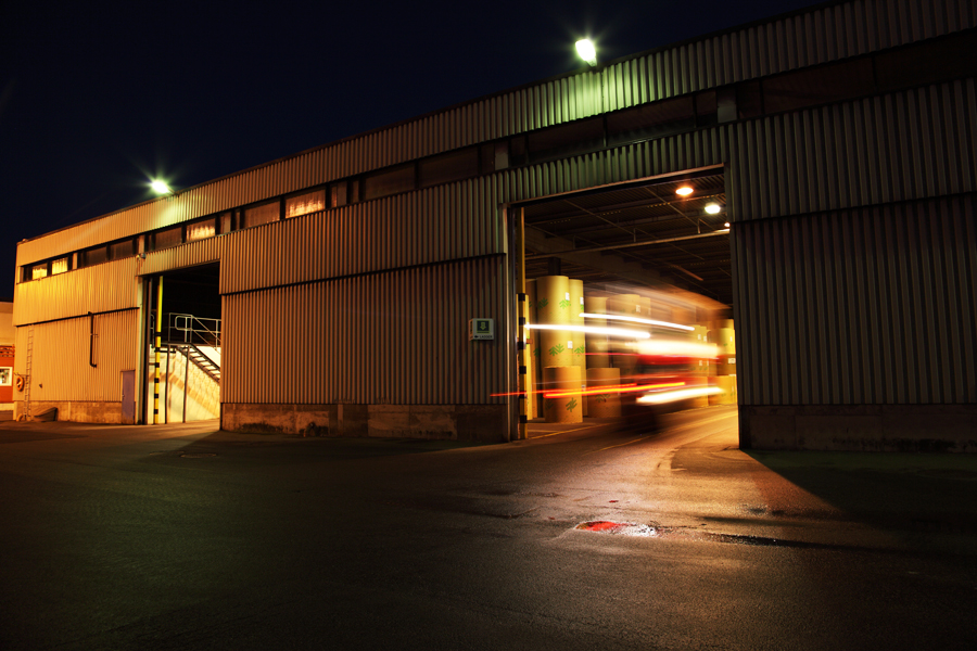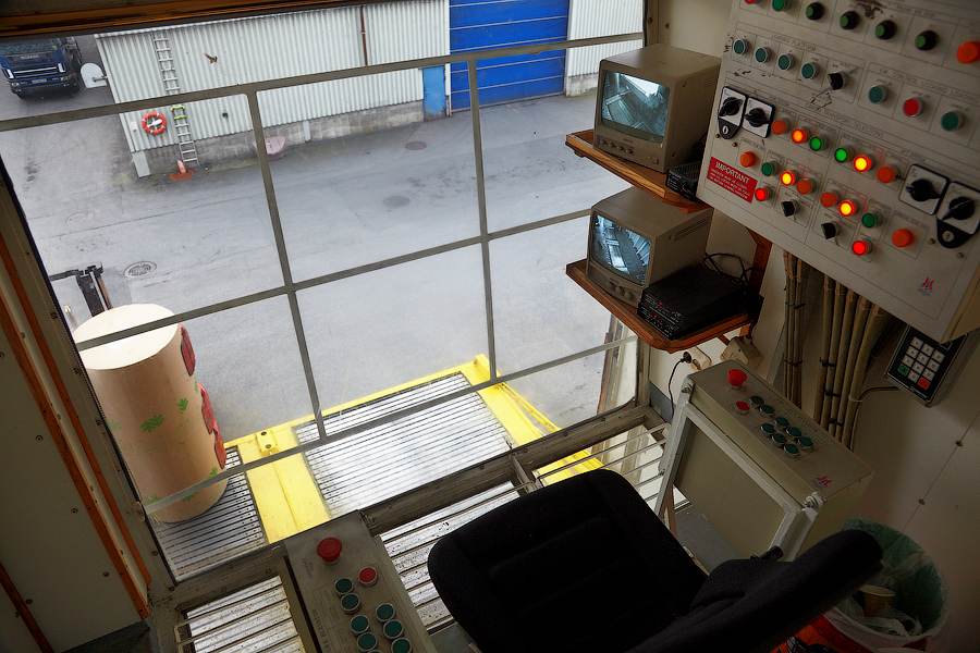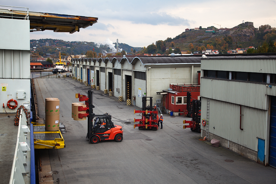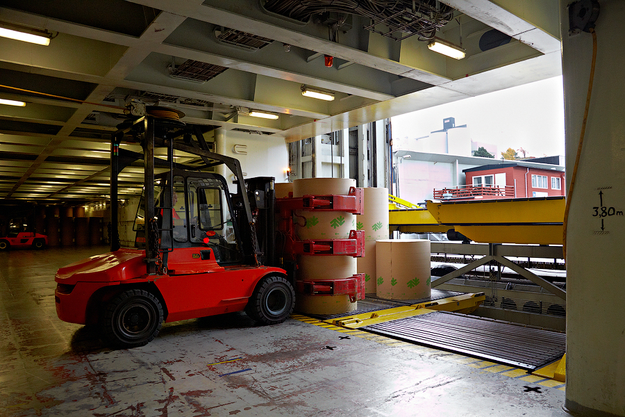Из береговых складов портовыми форклифтами подвозятся рулоны бумаги к нашему судовому грузовому лифту: