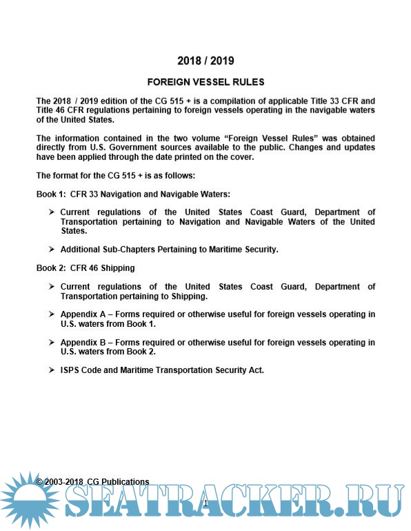 The 2018/2019 edition of the CG 515 + is a compilation of applicable Title 33 CFR and Title 46 CFR regulations pertaining to foreign vessels operating in the navigable waters of the United States.