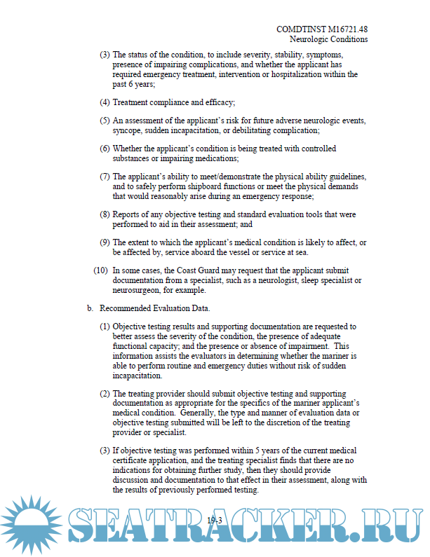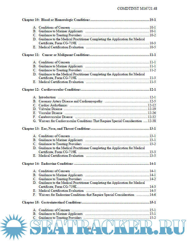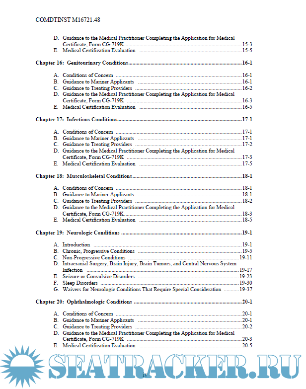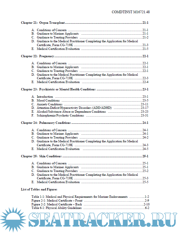 Year: 2019 Language: english Author: United States Coast Guard Genre: Manual Publisher: United States Coast Guard Format: PDF Quality: eBook Pages count: 297 Description: This Manual provides guidance for evaluating the physical and medical condition of applicants for merchant mariner medical certificates. The guidance in this Manual should assist medical practitioners, the maritime industry, individual mariners, and U.S. Coast Guard (hereinafter, Coast Guard) personnel in evaluating an applicant’s physical and medical status to meet the requirements of References (a) through (d). Ref: (a) Title 46 United States Code (U.S.C.), Subtitle II, Part E (b) International Convention on Standards of Training, Certification and Watchkeeping for Seafarers, 1978, as amended (STCW) (c) Title 46, Code of Federal Regulations (CFR), Part 10, Subpart C (d) Title 46 CFR Parts 401 and 402 (e) 80 Federal Register (FR) 8586, February 18, 2015