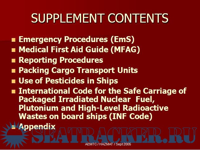 Section 1: Accidents Section 2: Conventions Section 3: IMDG Layout Section 4: Classification Sectoin 5: Stowage and Segregation Section 6: Packaging Section 7: Documentation Section 8: Supplement Supplement Contents: Emergency Procdures (EmS) Medical First Aid Guide (MFAG) Reporting Procedures Packing Cargo Transport Units Use of Pesticides in Ships INF Code Appendix