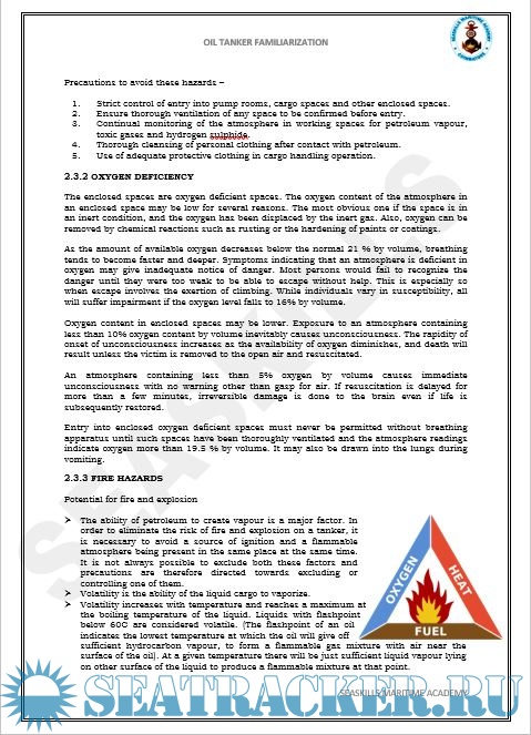 Year: 2xxx Language: english Author: Seaskills Maritime Academy Genre: Training courses Publisher: Seaskills Maritime Academy Format: DOC Quality: Unknown Pages count: 63 Description: INTRODUCTION A REVIEW OF SAFETY IN OIL TANKERS: #Danger can always be present in a tanker. # Most of the risk is removed by the designer. What risk remains can only be avoided by taking care. # This care must be taken by everybody aboard the ship. For you to be able to avoid risks # You must know what they are. This booklet warns you of the risks. # It explains how they can arise. It instructs how they can be avoided by you. # Terms are explained as we go along. If you already understand the terms, please be patient-your shipmate may not. # In this booklet petroleum means crude oil or products made from it. # Petroleum can be handled safely. Care is absolutely necessary-throughout the whole operation. #To be able to exercise care you need to know something about petroleum. # The characteristics of any substance which determine how it will behave under various conditions are known as the properties of the substance.