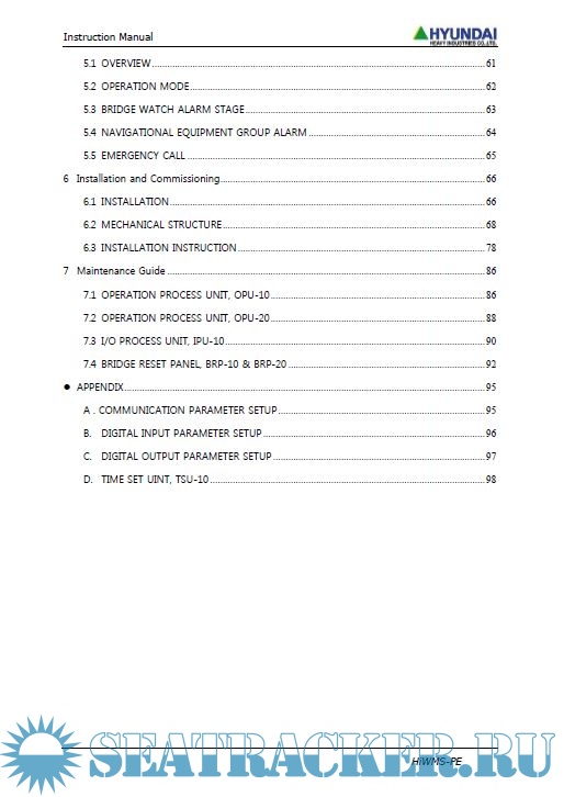 Description: This document describes the functionality and the guidance of operation and maintenance for bridge navigational watch alarm monitoring system, HiWMS-PE.