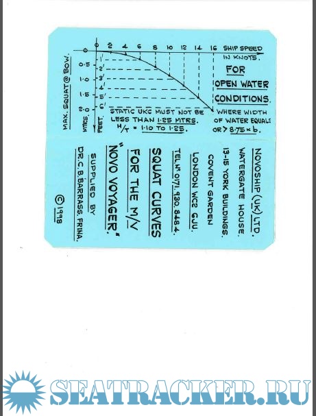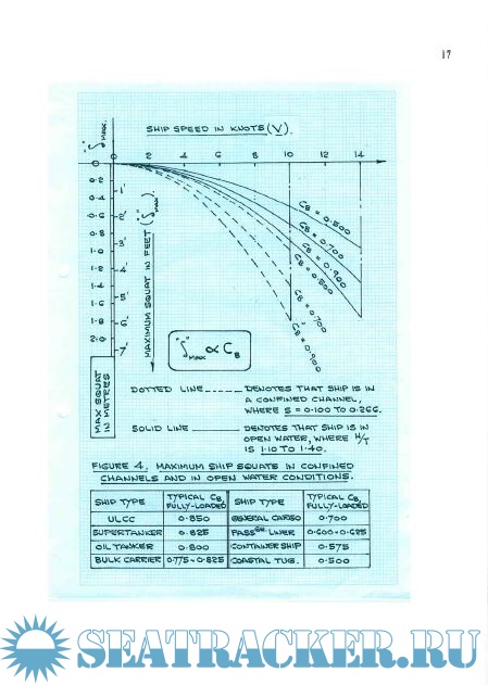 Tables and graphs of ship squat against ship speed are shown. The location of maximum sqauts for moving vessels that started with static trim are indicated.