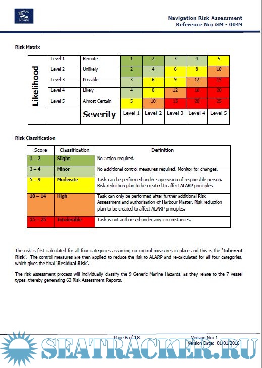 Year: 2016 Language: english Author: Nick Shearman Publisher: Port of Dover Edition: 1 Format: PDF Quality: eBook Pages count: 19 Description: The Port of Dover Navigational Risk Assessment document has been compiled to formally identify all the marine hazards both commercial and leisure within the jurisdiction of the Port. Further to this in order to support the Safety Management System (Port Marine Safety Code), a full assessment of the hazards has been carried out against a standard of acceptability. Where appropriate, risk reducing control measures have been put in place to eliminate or reduce the risk to as low as reasonably practicable (ALARP). In order to fully examine the hazards and risks, external stakeholders with specific skills and knowledge have been included in the process. As with any Safety Management System, we have a robust monitoring and review system in place within the Port Marine Safety Code to fully support the validity of the Navigation Risk Assessment document. For the purposes of this document the definition of “hazard” and “risk” are detailed below. “Hazard”: A potential source of harm, loss or injury. “Risk”: The probability of suffering harm or loss and is a measure of the frequency and consequence of a particular hazard.