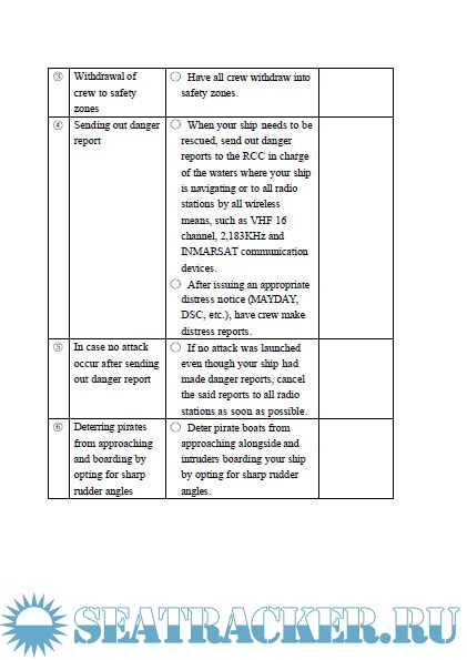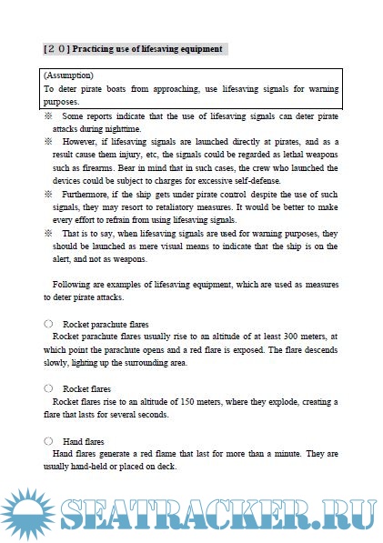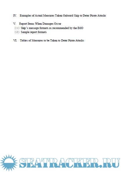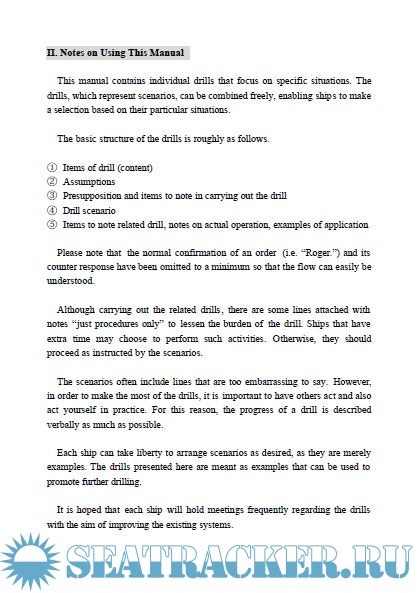 Year: 2004 Language: english Author: Japan Maritime Research Institute Genre: Manual Publisher: Japan Maritime Research Institute Format: PDF Quality: eBook Pages count: 78 Description: As a study in the fiscal year 2003, Japan Maritime Research Institute made a guiding manual for Japanese operators of ocean going ships, its operating ships, and relevant parties on concrete ways to deter pirate attacks and effective drills for onboard anti-piracy. Also it is aimed that the parties concerned to be thoroughly aware of what should be done. This manual is written in conversation form based on scenarios considering various situations such as finding a suspicious boat, excluding intruders by discharging water, etc, being under control by armed pirates, and is shown in Japanese-English.