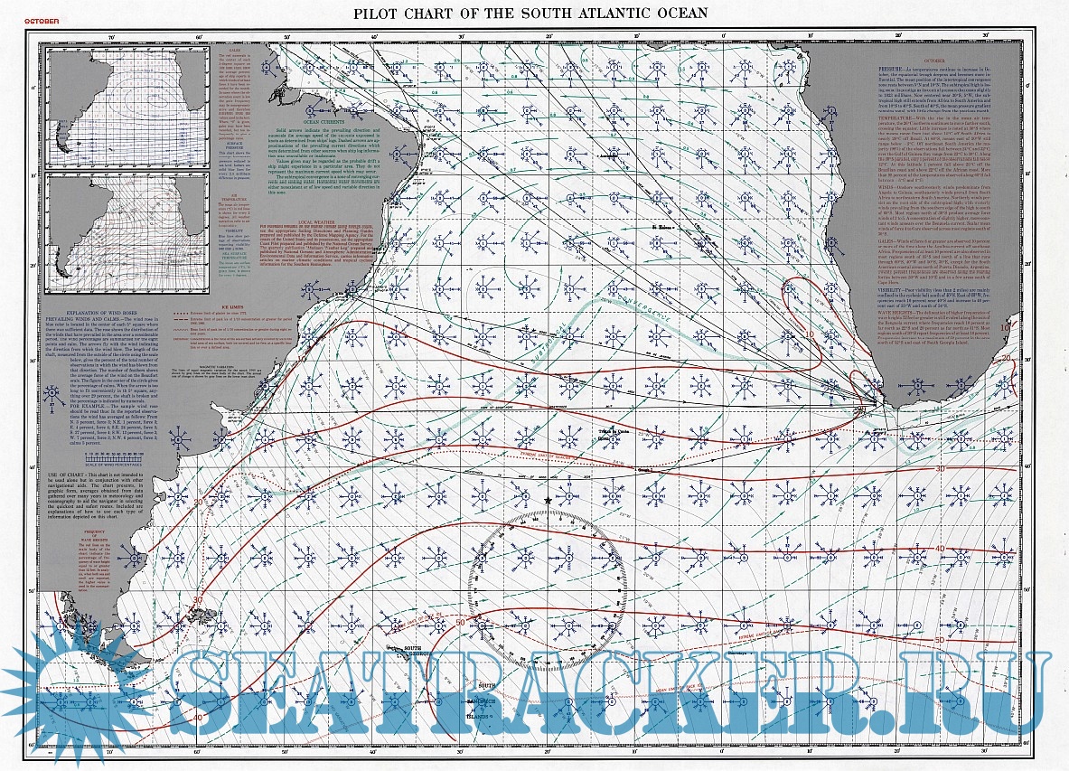 Description: The Atlas of Pilot Charts set is comprised of five volumes, each covering a specific geographic region. Each volume is an atlas of twelve pilot charts, each chart is compiled using average conditions over a single month of any given year. Pilot Charts depict averages conditions of winds, currents, temperatures, wave heights, ice limits, visibility, barometric pressure, and weather conditions. The purpose is to aid the navigator in selecting the fastest or safest routes with regards to the expected weather and ocean conditions. The charts are not intended to be used for navigation.