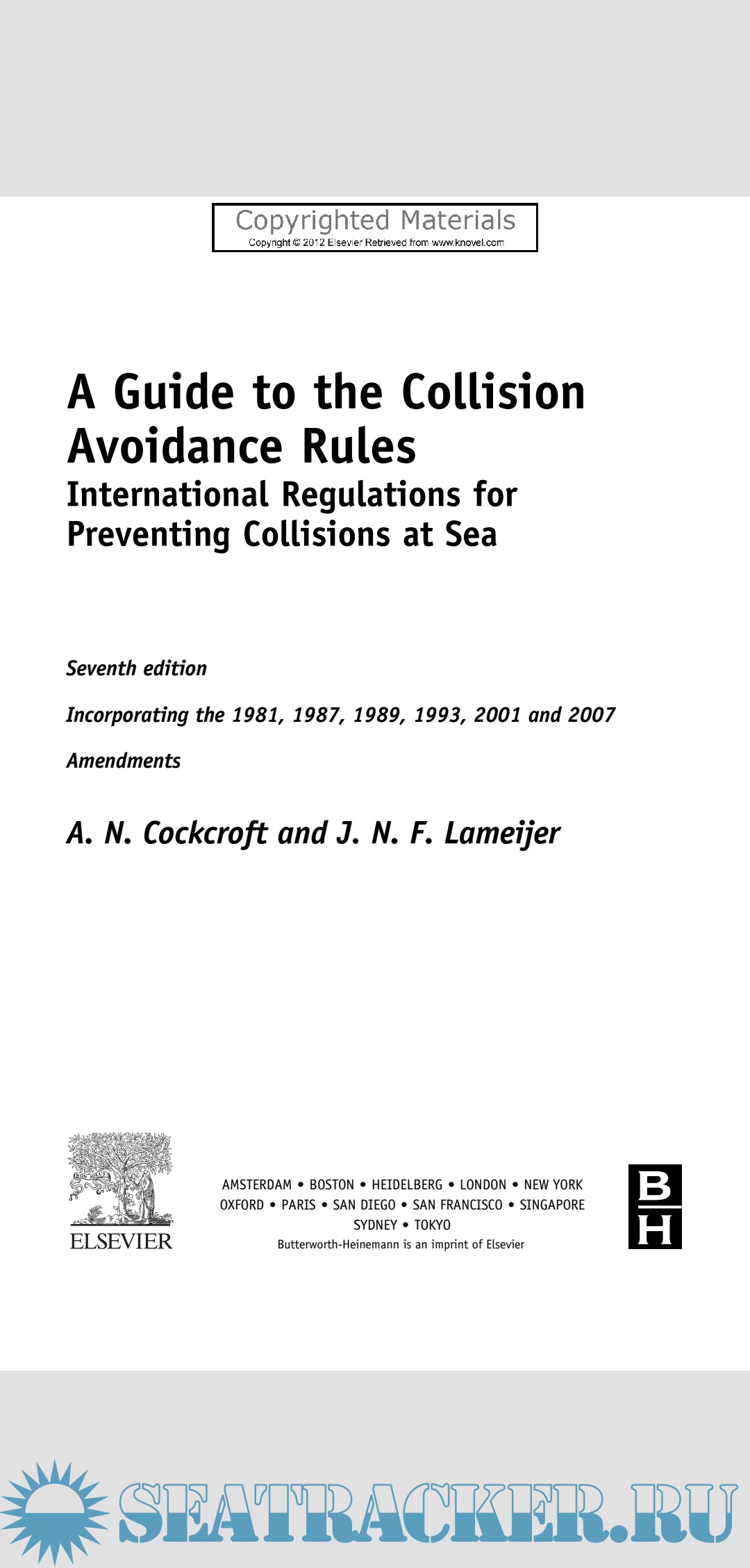 Year: 2012 Language: english Author: A. N. Cockcroft and J. N. F. Lameijer Genre: Guide Format: PDF Quality: eBook Pages count: 259 Description: When the Regulations for Preventing Collisions at Sea were revised at an International Conference held in 1960 the changes made were generally of minor character. Soon after the amended Regulations came into force in 1965 it became apparent that a more thorough revision was necessary to take account of such developments as the widespread acceptance and use of radar, the introduction of trafic separation and the increase in size and speed of many ships. At an International Conference held in October 1972 substantial changes were made and a new format was adopted. The 1972 Regulations came into force in 1977.
