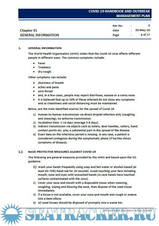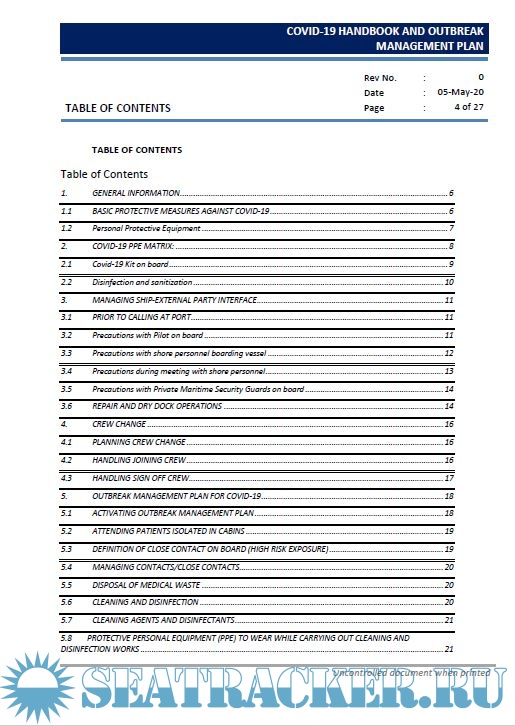 Description: This Covid-19 handbook and outbreak management plan provides procedures to be put in place to prepare Synergy ships for ‘ship-shore” interface and to protect our seafarers from the dangers posed by the new Coronavirus disease (Covid-19). These includes potential exposure from shore personnel and the actions to be taken in the event of a suspected case on board.