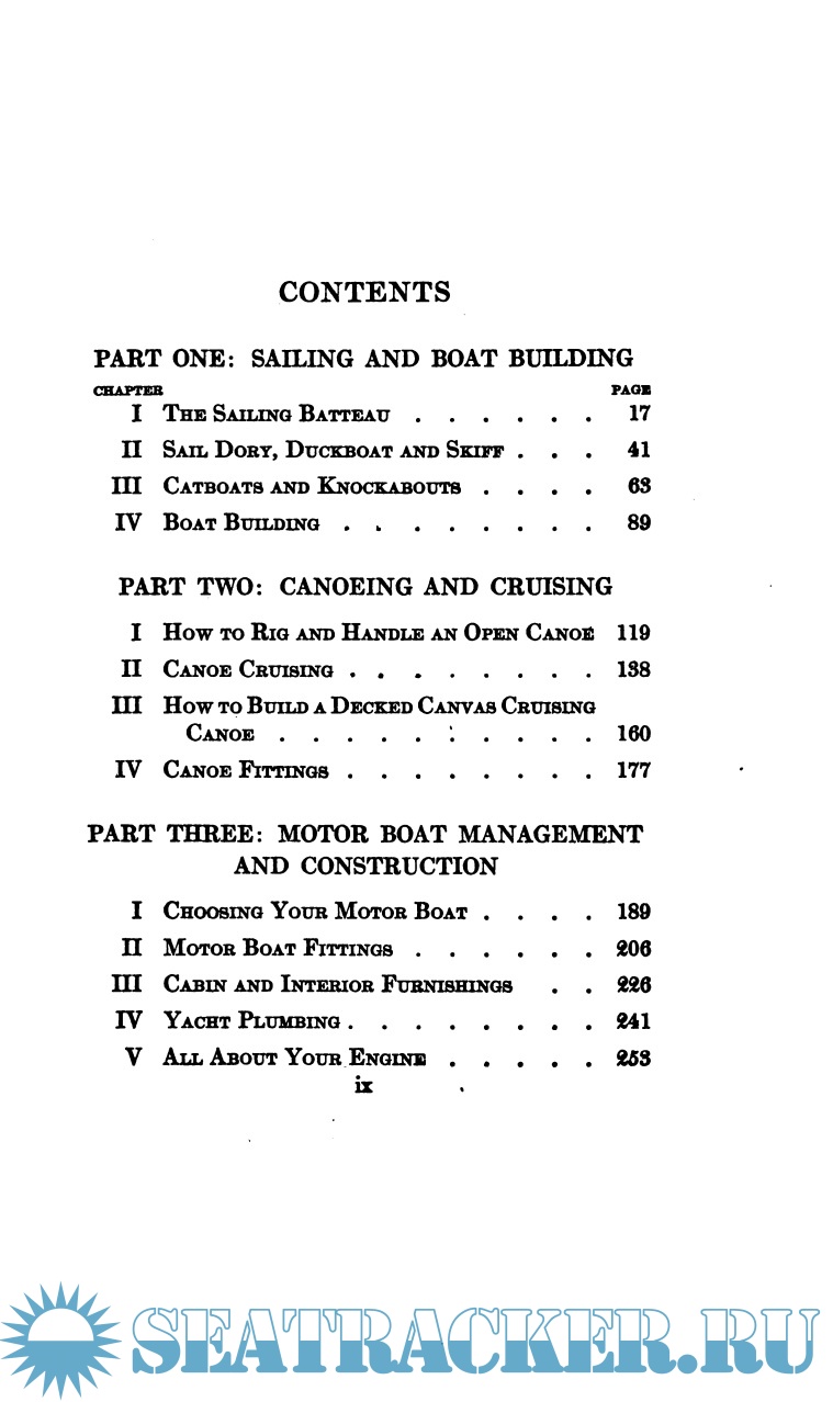 Year: 1919 Language: english Author: Miller W.H. Genre: Manual Publisher: George H. Doran co Format: PDF Quality: Photo of pages Pages count: 406 Description: This is a complete and accessible handbook on canoeing, sailing, and motor boating, being a guide to the general management and building thereof. Written in simple, plain language and profusely illustrated, "Canoeing, Sailing And Motor Boating" will be of considerable utility to modern boating enthusiasts and those with an interest in boat construction. Contents include: "The Sailing Batteau", "Sail Dory, Duckboat and Skiff", "Catboats and Knockabouts", "Boat Building", "Canoeing and Cruising", "How to Rig and Handle an Open Canoe", "Canoe Cruising", "How to Build a Decked Canvas Cruising Canoe", "Canoe Fittings", "Motor Boat Management and Construction", etc.