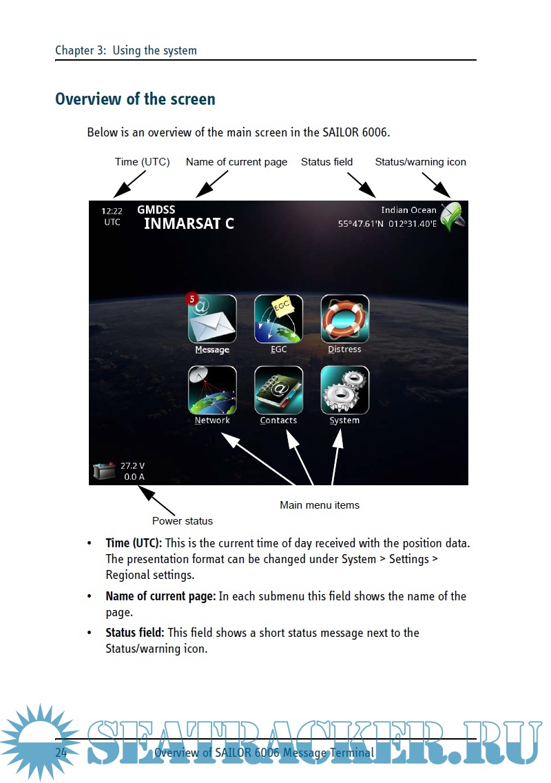 Year: 2012 Language: english Author: Thrane & Thrane Genre: Manual Publisher: Thrane & Thrane Format: PDF Quality: eBook Pages count: 128 Description: Inmarsat C is a two-way store and forward communication system, designed to send and receive data packets, via relatively small and low-cost terminals and antennas, virtually anywhere in the world, ship-ship, ship-shore, and shore-ship. To comply with GMDSS requirements Inmarsat C and Mini C terminals include an integrated Global Navigational Satellite Services (GNSS) receiver, providing automatic terminal position updates and reporting when a distress alert is initiated. The SAILOR 6110 is a GMDSS approved communication system designed for use with the Inmarsat C satellite network, and supports the following services: - Distress alerting and Distress priority messaging - Enhanced Group Calling (EGC), via SafetyNET or FleetNET - Message transmission - Position reporting - Data reporting and polling The basic Inmarsat 6110 mini-C system consists of a small omnidirectional antenna SAILOR 3027, a SAILOR 6006 Message Termimnal, a SAILOR 1252 Printer, and a SAILOR 6101/6103 Alarm Panel.
