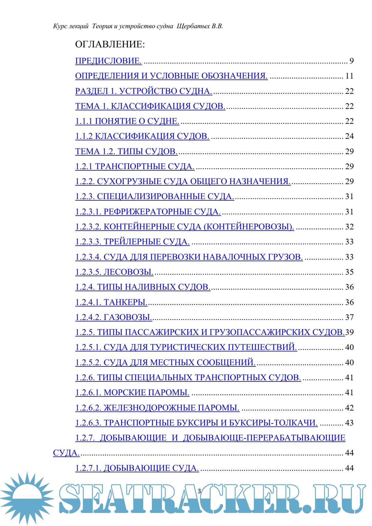 Предисловие. Определения и условные обозначения. Устройство судна. Классификация судов. Типы судов. Конструкция корпуса металлических судов. Архитектурно-конструктивные типы судов. Судовые устройства. Шлюпочное устройство и спасательные средства. Грузовое устройство. Общесудовые системы. Требования морского регистра к техническому состоянию судов. Организация технологического обслуживания и ремонта судна и его систем при эксплуатации. Теория судна. Понятие о геометрии корпуса судна. Плавучесть судна. Остойчивость судна.