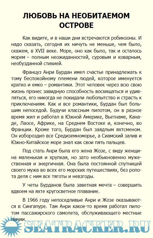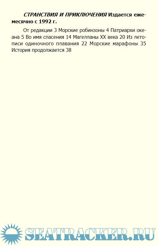 В брошюре рассказано о необычайных приключениях мореплавателей, отважившихся путешествовать на яхтах и плотах в одиночестве,