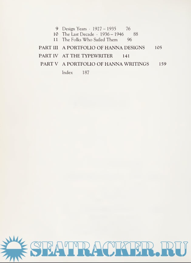 Although this book gives top billing to the Tahiti ketch, its real subject is the entire career of the naval architect and nautical writer whose name for more than twenty-five years of American boating his¬ tory was synonymous with “sturdy boats, well built.’’ The first section, a biography of Hanna, is followed by a detailed presen¬ tation of more than thirty of his most im¬ portant designs, each handsomely illus¬ trated and with detailed specifications and photographs. This section also includes a sprinkling of vignettes and cruising lore from Hanna boat owners. The final section is a collection of Hanna’s own nautical writing, collected (and in a few cases, pub¬ lished) for the first time.