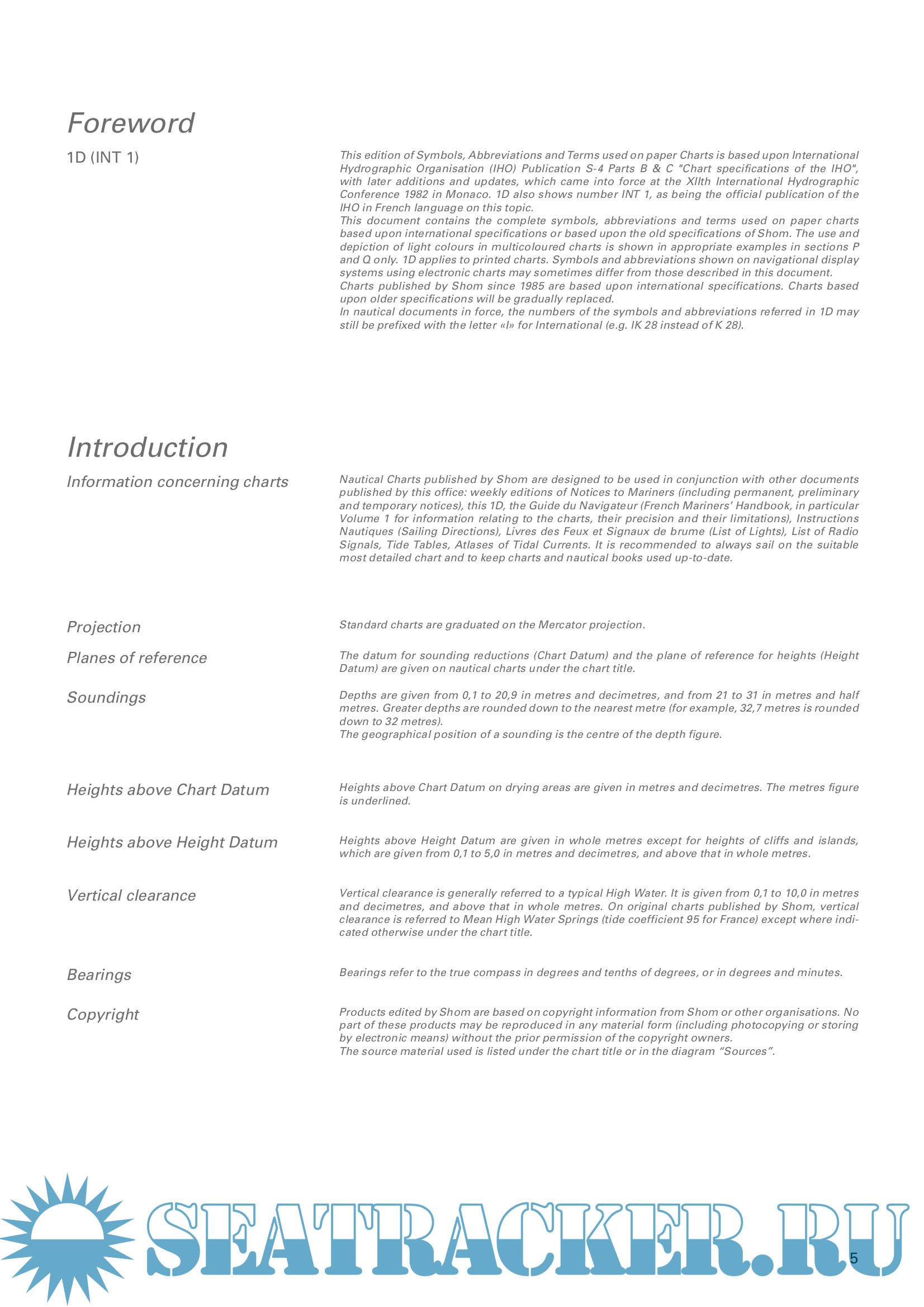 Description: On trouve dans ce document l’ensemble des symboles, abréviations et termes utilisés aussi bien sur les cartes marines aux normes internationales que sur les cartes marines aux normes anciennes du Service hydrographique et océanographique de la marine (Shom). L’ouvrage 1D s’applique aux cartes marines imprimées. Les symboles et abréviations affichés sur les écrans de navigation utilisant des cartes marines électroniques peuvent parfois différer de ceux décrits dans cet ouvrage.
