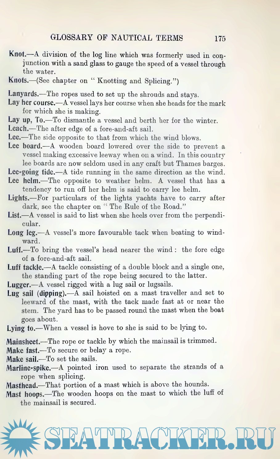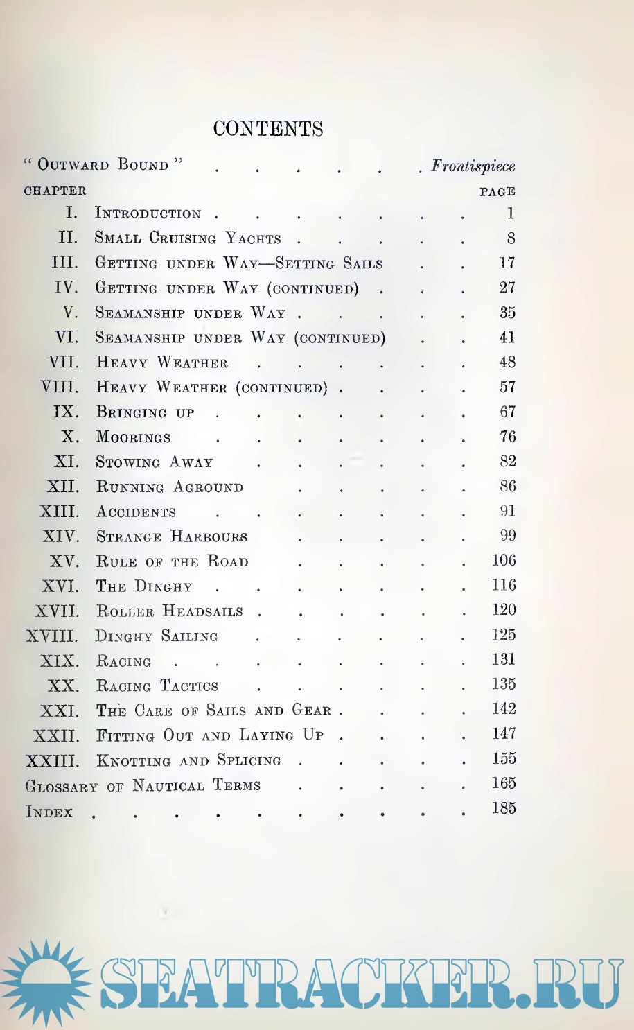 Year: 1923 Language: english Author: Francis B. Cooke Genre: Manual Publisher: Longmans, Green & Co. Format: PDF Quality: Scanned pages + text layer Pages count: 206 Description: This book was written in an era of transition from large yachts, that needed professional crews to small yachts, usually sailed by the owner and his family, without paid hands. The idea is that anyone who acquires a knowledge of the general principles of seamanship can, with a little practice, soon learn to sail a small yacht with confidence. The aim of the book is to explain the theory of seamanship and its practical application in simple language that should be intelligible to the beginner. A full glossary of nautical terms has been added for convenience, as well as diagrams of knots and hitches, to explain the basis of the marline-spike seamanship.
