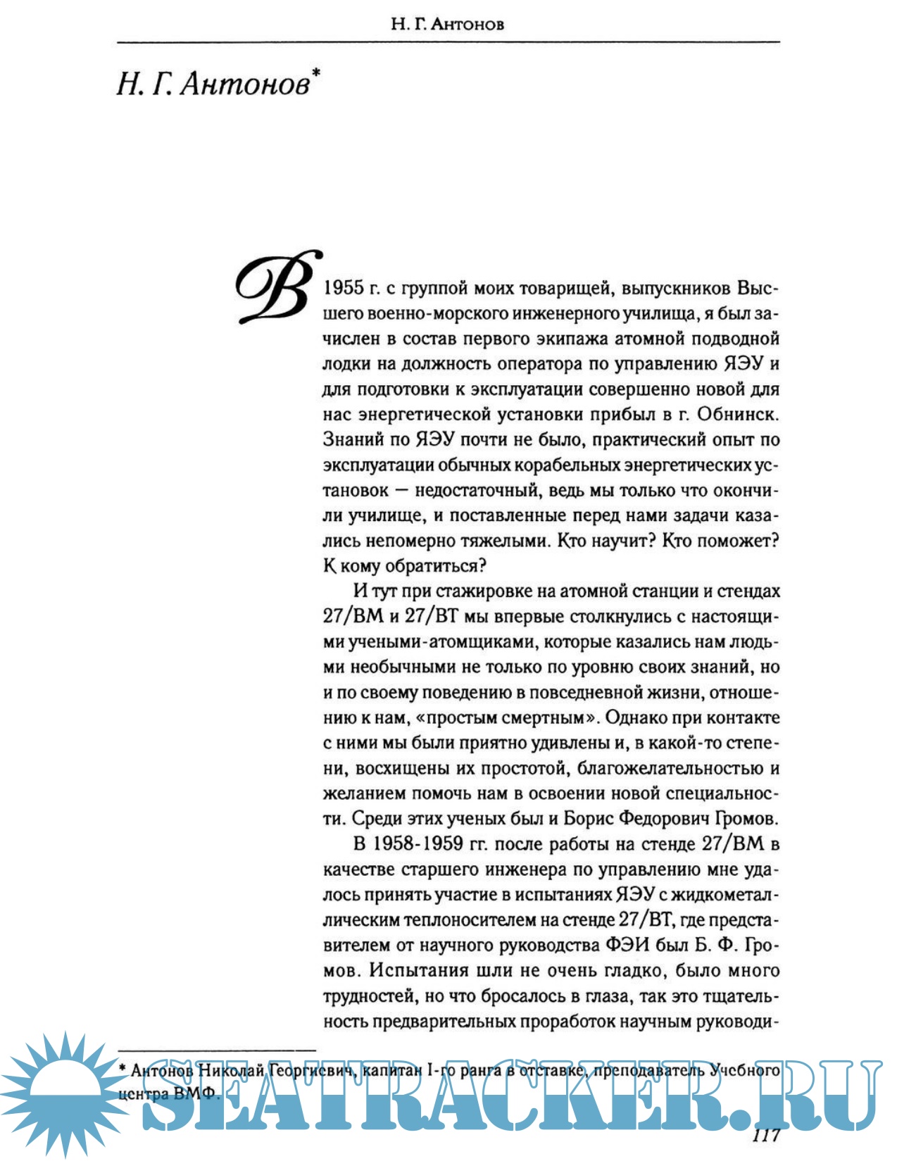 Описание: Книга посвящена 80-летию со дня рождения Громова Бориса Фёдоровича - заместителя директора Физико-энергетического института (1972—2000), лауреата Ленинской премии (1961), лауреата Государственной премии СССР, заслуженного деятеля науки и техники РСФСР. Громов впервые в мире обосновал атомную энергетическую установку с жидкометаллическим теплоносителем (ЖМТ), ставшей прообразом последующих реакторов для атомных подводных лодок. В Северодвинске был построена АПЛ проекта 645 с двумя реакторами, охлаждаемыми жидкометаллическим теплоносителем. Лейпунский и Громов курировали все этапы её строительства и монтажа. В 1968 году после нескольких успешных автономных походов в подлёдные северные воды, экваториальные воды и Средиземное море произошла авария на реакторе правого борта, в результате которой погибло несколько человек. Громов взял ответственность за эту аварию на себя и выступил координатором работ по улучшению реактора.