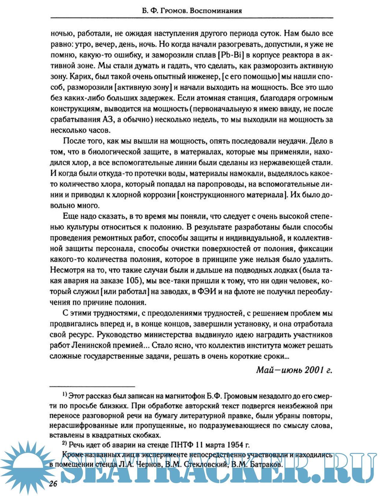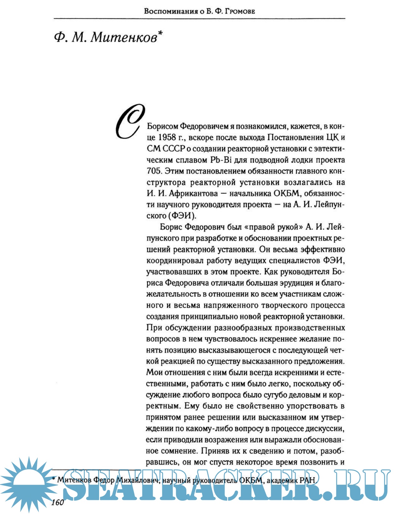 Год выпуска: 2007 Язык: русский Автор: Зродников А.В. Жанр: История Издательство: ГНЦ РФ - ФЭИ Формат: PDF Качество: Отсканированные страницы Количество страниц: 231 Описание: Книга посвящена 80-летию со дня рождения Громова Бориса Фёдоровича - заместителя директора Физико-энергетического института (1972—2000), лауреата Ленинской премии (1961), лауреата Государственной премии СССР, заслуженного деятеля науки и техники РСФСР. Громов впервые в мире обосновал атомную энергетическую установку с жидкометаллическим теплоносителем (ЖМТ), ставшей прообразом последующих реакторов для атомных подводных лодок. В Северодвинске был построена АПЛ проекта 645 с двумя реакторами, охлаждаемыми жидкометаллическим теплоносителем. Лейпунский и Громов курировали все этапы её строительства и монтажа. В 1968 году после нескольких успешных автономных походов в подлёдные северные воды, экваториальные воды и Средиземное море произошла авария на реакторе правого борта, в результате которой погибло несколько человек. Громов взял ответственность за эту аварию на себя и выступил координатором работ по улучшению реактора. В 1954 году стал заведующим лабораторией ФЭИ, в 1964 — директором отделения. В 1972 году, после смерти Лейпунского, стал заместителем директора ФЭИ и возглавил направление ЯЭУ. Создатели атомной подводной лодки проекта 705 (всего было построено семь лодок, (в 1993 году АПЛ проекта 705 была занесена в книгу рекордов Гиннесса) были удостоены Государственной премии СССР. Громов получил премию за научное руководство созданием судовых энергетических установок для этого проекта.