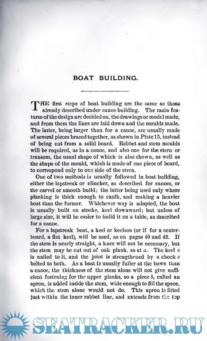 best adapted to the amateur rather than the professional. Canoe building is treated in detail, as the processes involved are common to all boatbuilding, only requiring greater care and skill than ordinary work. The principles, once mastered, may be applied to the construction of any of the small craft, such as rowboats and skiffs. The edition is enriched by plates and explanatory tables with measurements of the construction materials.