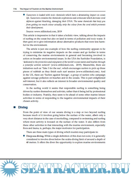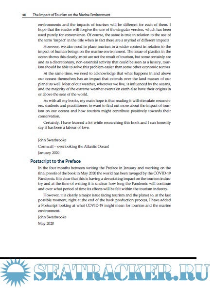 Year: 2020 Language: english Author: John swarbrooke Genre: Technical book Publisher: Goodfellow Publishers Ltd Edition: 1st ed. ISBN: 1911635581 Format: PDF Quality: eBook Pages count: 332 Description: The first text to take a truly inter-disciplinary approach to critically examining the impacts of tourism on marine environments and coastal regions, focusing on the negative environmental impacts but also looking at the social and economic context of marine tourism and coastal zone management. The book sets tourism against the background of the crisis facing our oceans due to climate change and the effects of global warming. Tourism adds another layer of challenges for our marine environment, and its rapid growth globally means that these challenges have grown dramatically in recent years. We have seen a number of trends in the relationship between tourism and our oceans which pose a threat to the future of the marine environment and coastal communities. The Impact of Tourism on the Marine Environment looks at these trends in detail and tackles issues such as: • A critical evaluation of the cruise sector in terms of its impacts on the marine environment and the coastal destinations visited by cruise ships. • Marine wildlife watching and whether it is the enemy of conservation or its ally • The overall impact of tourism on waste, litter and plastics in the oceans. • The two-way relationship between climate change and global warming and marine environments and coastal tourist destinations • The effects of leisure activities such as diving and sea angling on the marine environment including coral reefs • The consumption of marine resources to meet tourist demand for seafood and souvenirs that deplete ocean resources • Natural and man-made disasters which have their origins in the oceans but have an impact on coastal tourist destinations • The challenges involved in the planning and management of tourism in marine environments and the impacts of the construction of new resorts and tourism infrastructure. • The debate over whether there is a need for regulation to control the impacts of tourism on our oceans or whether industry self-regulation is the best approach to take The book includes nearly forty mini-case studies from around the world which illustrate issues raised in the text. There are also two important ‘opinion pieces' from Professor Harold Goodwin and Professor Michael Hall. A must-have text for students, researchers and practitioners looking at issues of sustainable tourism, tourism planning, environmental management, geography, marine conservation and corporate social responsibility.