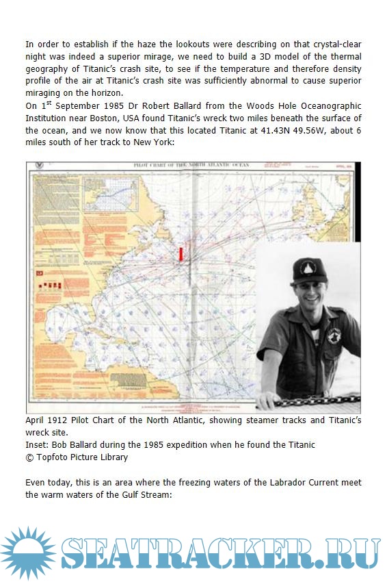 night, which in turn brought him in front of some of the world's experts in refraction and thermal inversion. Patiently logging together the details of the mirage effect created that night by the conditions, Maltin finally discovered what a hundred years of Titanic investigations have failed to prove: why the ship hit the iceberg.