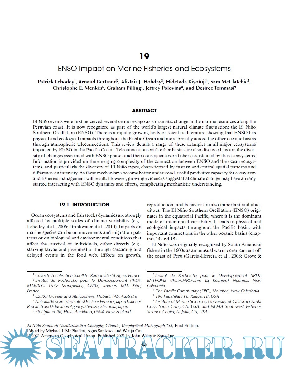 Year: 2020 Language: english Author: Various authors Genre: Reference book Publisher: Wiley ISBN: 9781119548126 Format: PDF Quality: eBook Pages count: 502 Description: El Niño Southern Oscillation (ENSO) in the Pacific Ocean is a meteorological phenomenon with a huge impact on atmosphere and ocean circulation, and on marine and terrestrial ecosystems, that has important social and economic consequences. This book is a comprehensive and up-to-date work on Earth’s most dominant climate variation. It presents the latest theories, models, and observations, and explores the challenges of forecasting ENSO as the climate continues to change. Topics include: historical background on ENSO and its social consequences, review of key El Niño (ENSO warm phase) and La Niña (ENSO cold phase) characteristics, description of the underlying physical processes, impacts on ocean, weather, and climate events, including tropical cyclones, how ENSO affects fisheries Additional info: Editors: Michael J. McPhaden, Agus Santoso, Wenju Cai