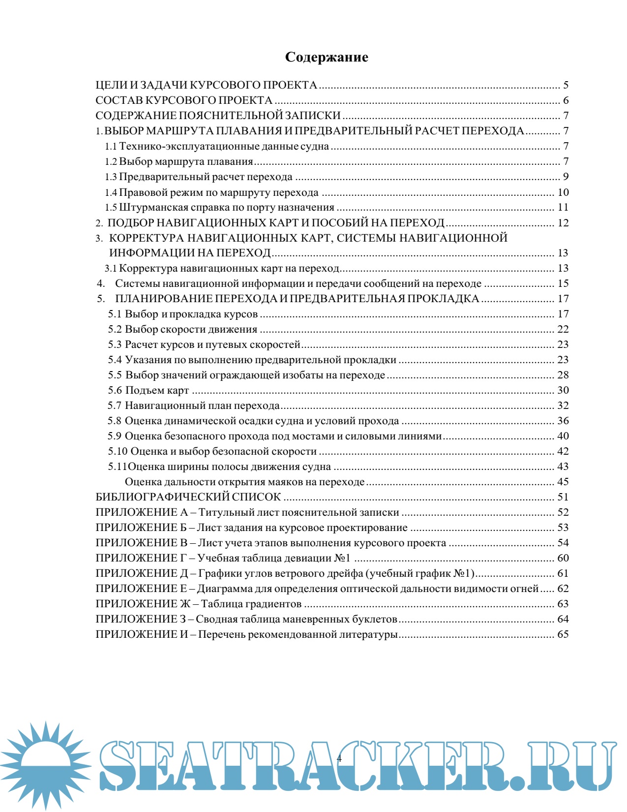 Цели и задачи курсового проекта. Состав курсового проекта. Содержание пояснительной записки. Выбор маршрута плавания и предварительный расчет перехода. Подбор навигационных карт и пособий на переход. Корректура навигационных карт, системы навигационной информации на переход. Системы навигационной информации и передачи сообщений на переходе. Планирование перехода и предварительная прокладка. Оценка дальности открытия маяков на переходе. Библиографический список. Приложения.