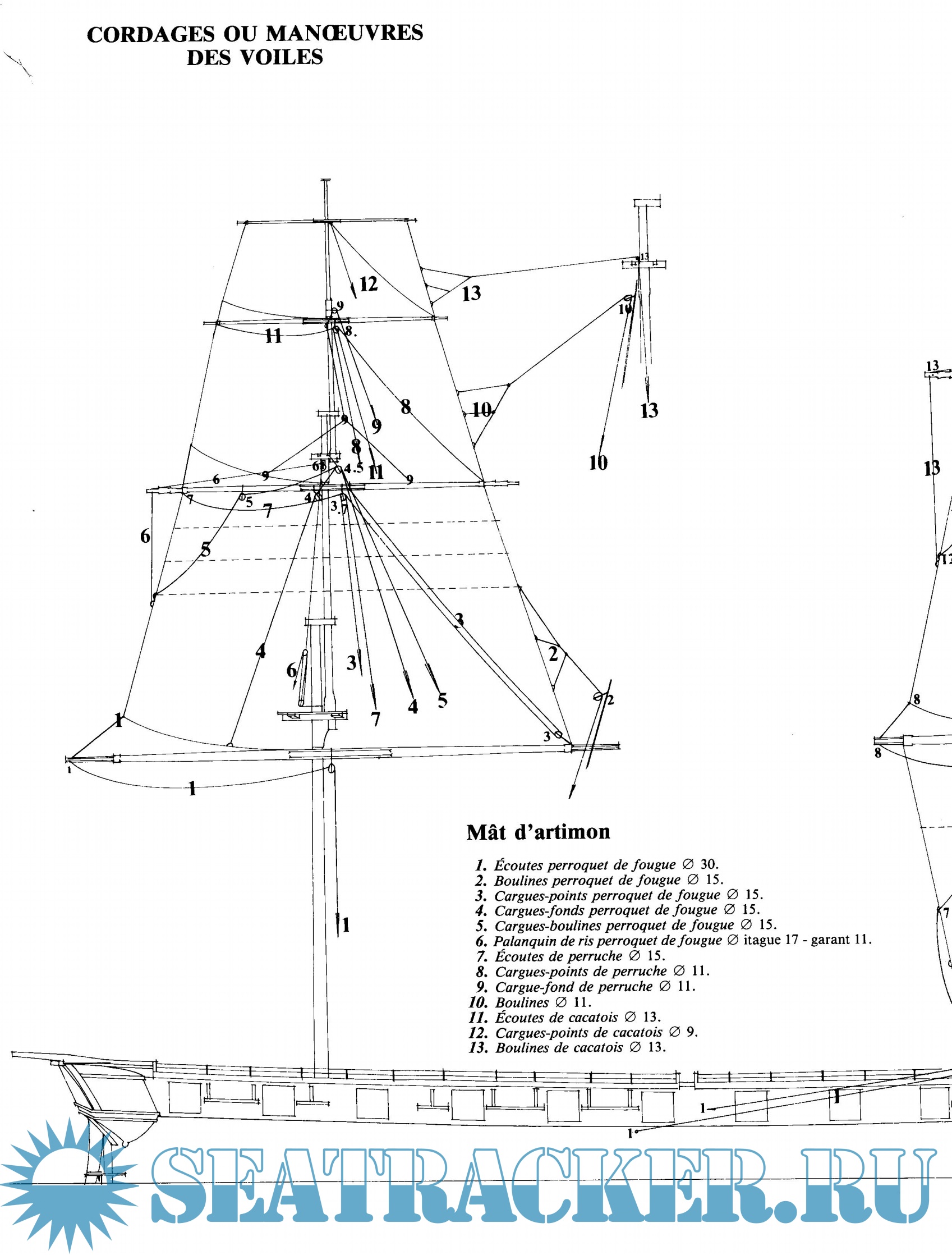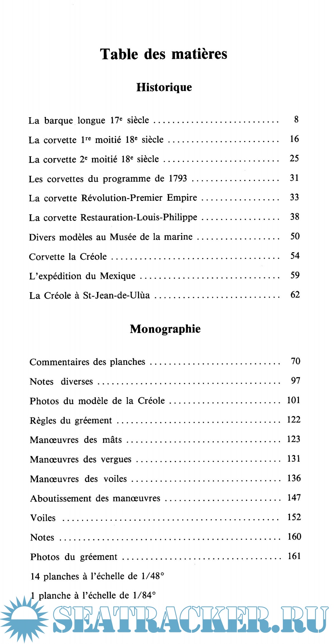 LISTE DES PLANCHES au 1/48ème - 1) Définition de la coque I 2) Définition de la coque II 3) Bordage de la coque 4) Doublage cuivre de la carène 5) Bordage et vaigrage du pont 6) Réalisation proue et poupe 7) Élévation de la coque accastillée 8) Coupes longitudinales et transversales 9) Vues avant et arrière 10) Ensemble du pont 11) Éléments de mâture I 12) Éléments de mâture II, Hunes, Barres 13) Embarcation et ancres 14) Artillerie et éléments d'accastillage 15) La Créole sous voile à l'échelle du 1/84ème.