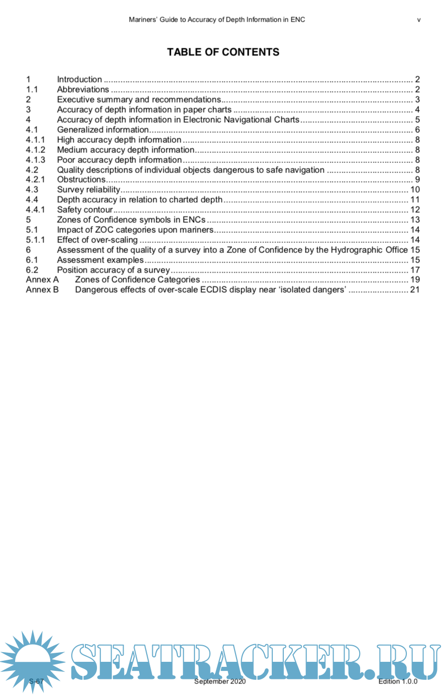 Description: IHO publication S-67 “Mariners Guide to Accuracy of Depth Information in ENC” is a guide to navigators, and navigator training organizations, on the degree of confidence they should have in the adequacy and accuracy of charted depths and their positions in an Electronic Navigational Chart.