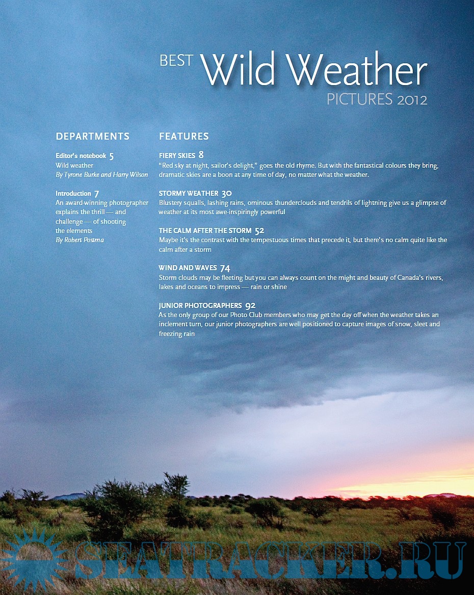 Description: Weather is something we are used to living with from birth, no matter if we are on land, at sea or in the mountains. It changes very quickly, in minutes, so that sometimes it's challenging to freeze a moment in a picture. This book is a collection of the best weather and nature pictures from Canadian Geographic (2012). Selected from annual Canadian Geographic's annual photo contest, they provide a good look onto some of wildest and most spectacular events: lightning strikes, skies painted tones of red or bruised blues and purples, crashing Great Lakes waves and storms. Topics are arranged in thematic chapters: Fiery skies, Stormy weather, The calm after the storm, Wind and wawes, and junior photographers. Each picture has a brief caption and note.
