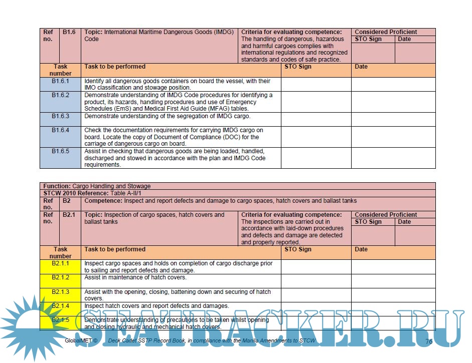 The book is designed to provide deck cadets with a practical, structured, onboard training programme that covers the requirements of STCW 2010. The level of knowledge, understanding and proficiency required is to be sufficient for watchkeeping and other onboard duties to be effectively carried out. It is recognised that the development of competence in activities difficult to teach in the onboard environment will need the support of shore-based teaching. The programme of onboard training is an integral part of the overall training plan. The comprehensive provisions in the book enable a cadet to complete appropriate tasks prior to joining a ship if circumstances permit. In this case, provided the Cadet can produce evidence of having successfully completed the task, the Shipboard Training Officer (STO) may sign the „considered proficient‟ column following oral questioning and without requiring full performance of the task.