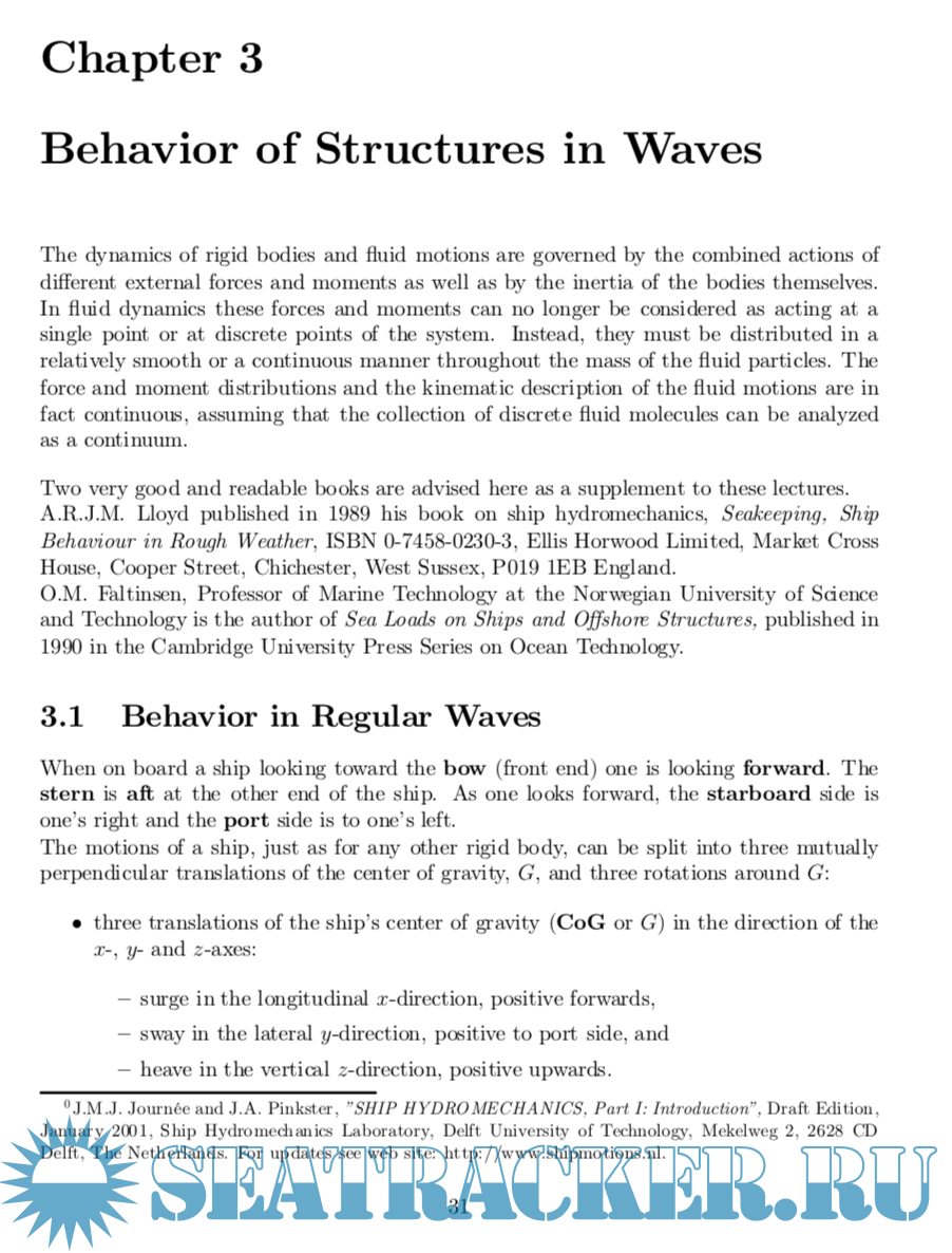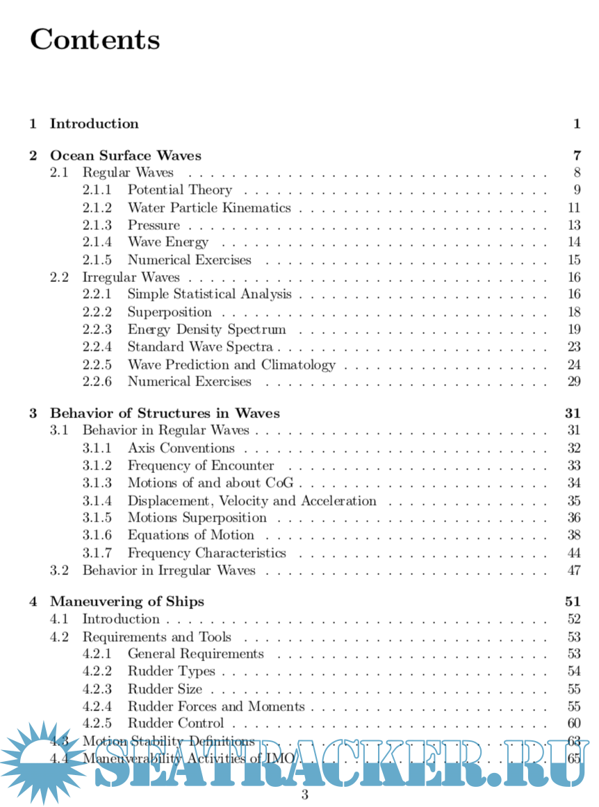 Year: 2002 Language: english Author: J.M.J. Journée, J.A. Pinkster Genre: Textbook Publisher: University of Delft Edition: Draft Edition Format: PDF Quality: eBook Pages count: 107 Description: This preliminary text book is a ...rst attempt to provide a short introduction in ship hy- dromechanics for Maritime Engineering students (second year) at the Delft University of Technology. Topics have been selected for inclusion based upon their applicability in mod- ern maritime engineering practice. The treatment of these selected topics includes both the background theory and its applications to realistic problems. The notation used in this book is kept as standard as possible, but is explained as it is introduced in each chapter. In some cases the authors have chosen to use notation commonly found in the relevant literature - even if it is in con‡ict with a more universal standard or even with other parts of this text. This is done to prepare students better to read the literature if they wish to pursue such maters more deeply. In some other cases, the more or less standard notation and conventions have been adhered to in spite of more common practice. These lecture notes on an introduction in ship hydromechanics consists of three parts: waves, shipmotions and maneuvering.