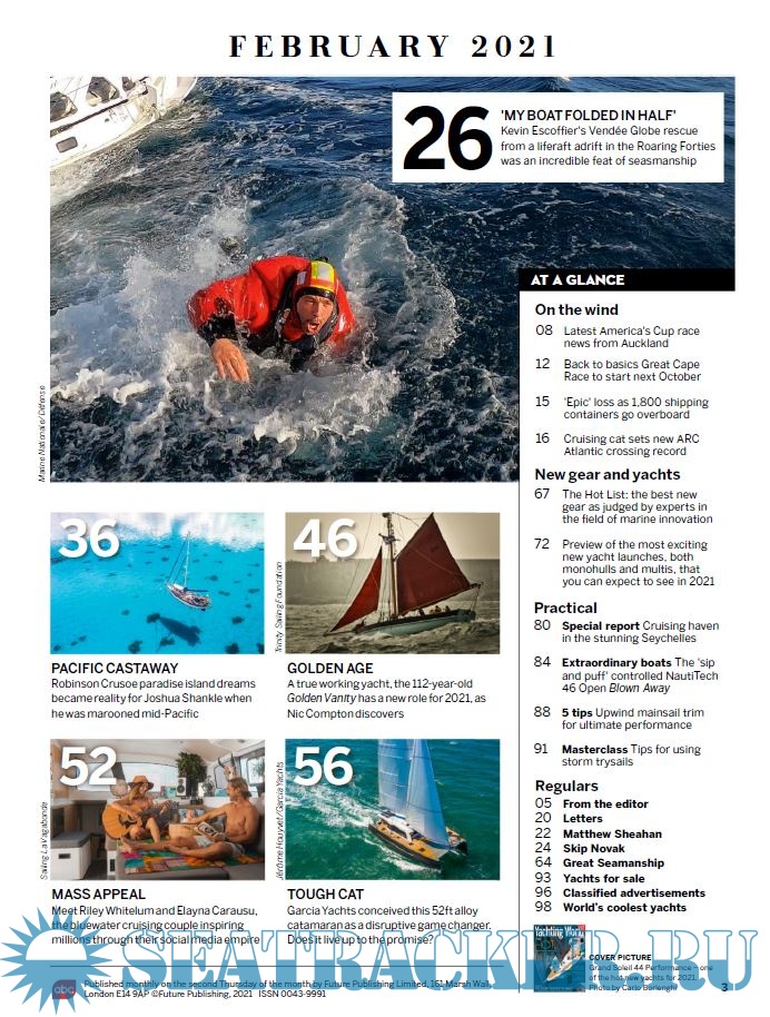Description: In the February 2021 issue of Yachting World, Kevin Escoffier recounts the story of his recent sinking in the Vendee Globe, and Joshua Shankle tells the story of his mid-Pacific