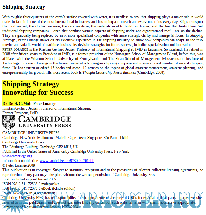 Year: 2009 Language: english / russian Author: Dr. Dr. H. C. Mult. Peter Lorange Publisher: CAMBRIDGE UNIVERSITY PRESS Format: EPUB Quality: eBook Pages count: 335 Description: Shipping Strategy - Innovating for Success Dr. Dr. H. C. Mult. Peter Lorange 2009 - CUP
