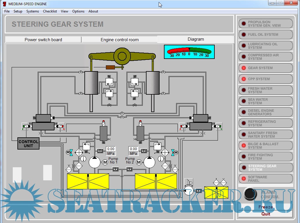 The UNITEST MS Engine Room Simulator has been based on typical solutions, being presently used in medium-sized engine rooms (two four-stroke type main engines with reduction gear and CPP - controllable pitch propeller).