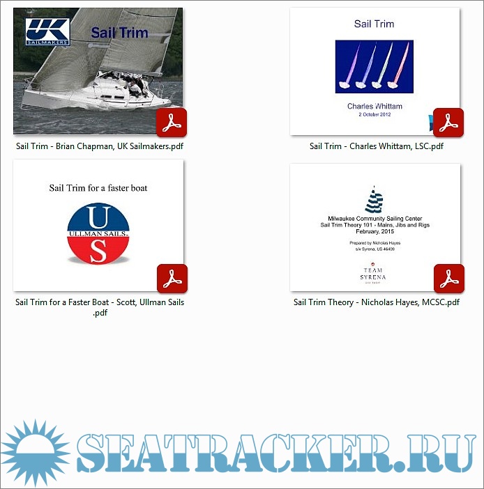 Description: The folder contains 4 documents on sail trim (intermediate to advance level). Documents are slide presentations in pdf format, ranging from basic concepts and nomenclature to more advanced ones, like twist control, leech control, and use of stays, outhauls and halyards to change sail shape.