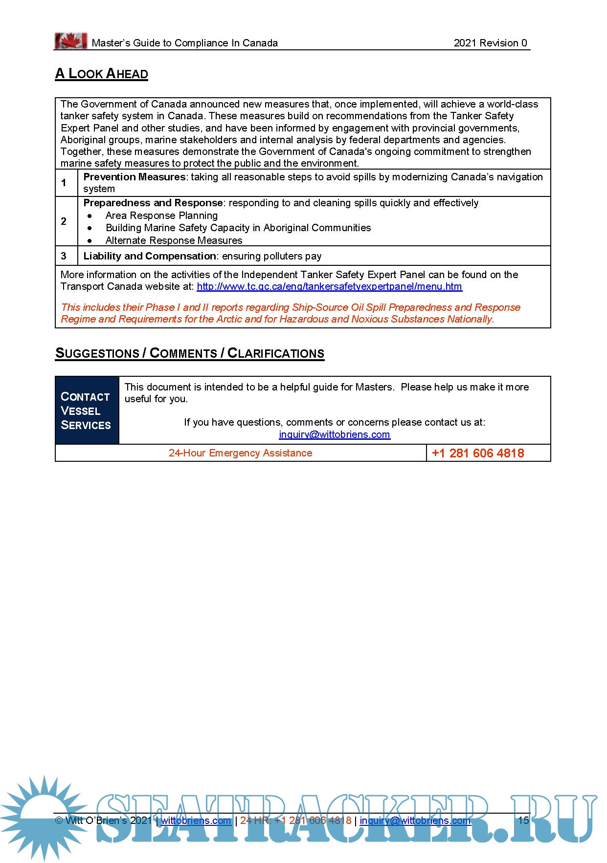 Year: 2021 Language: english Author: Witt O'Brien's Genre: Guide Publisher: Witt O'Brien's Format: PDF Quality: eBook Pages count: 15 Description: INTRODUCTION: The Master of any vessel making a call to Canada faces several regulatory issues that are specific to Canada. This guide is intended to help the Master effectively and efficiently face these issues. Witt O’Brien’s is providing this guide to help ensure your compliance. Use of the directions in the guide will allow Witt O’Brien’s to better serve you. Information designed to save you time and effort is present in orange italics. .