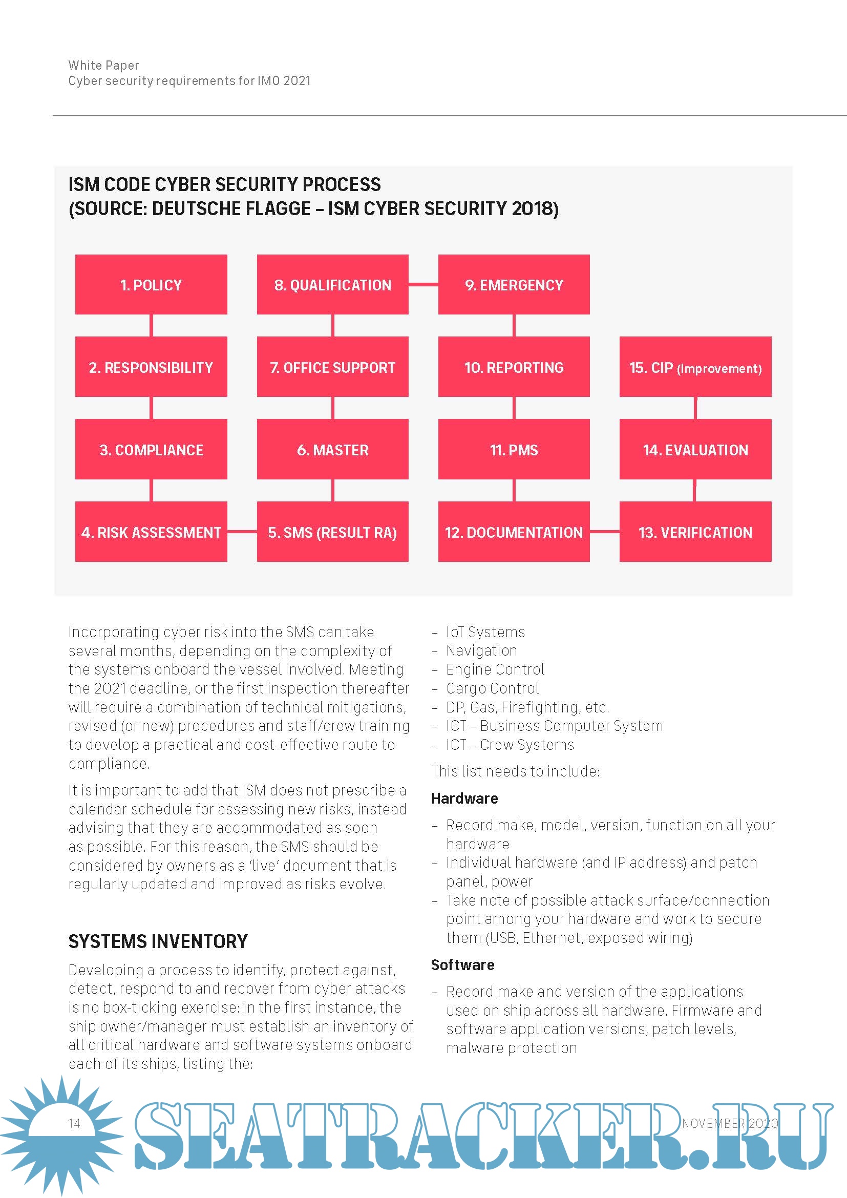 Year: 2020 Language: english Author: INMARSAT Genre: Guide Publisher: INMARSAT Format: PDF Quality: eBook Pages count: 38 Description: Developments in connectivity and the transfer of data in greater volumes between ship and shore continue to bring significant gains for fleet management efficiency and crew welfare, but they also increase the vulnerability of critical systems onboard vessels to cyber attacks. By International Maritime Organization (IMO) resolution, no later than a ship's first annual Document of Compliance audit after 1 January 2021, every Safety Management System must be documented as having included cyber risk management, in line with the International Safety Management Code. The following report offers ship owners and managers guidance covering their responsibilities under the new IMO regime.
